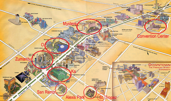 The acrobats/performers remain active on this mobile set regardless of the impossible inclines. Within moments, all laws of gravity seem defied while acrobatics, martial arts, Myst/Michael Parkes-type costumes and fluidly morphing ambiance intermingle. You begin to believe that anything super-human is possible. It's a realm of magic that never fractures. Rather, the constantly changing perspective anchored by the position of the stage induces a massive altered state. In order to see people from above, you normally have to fly or be out of your body. When the stage goes fully vertical and fantastical creatures engage in aerial combat suspended from invisible wires, you indeed observe them from a bird's eye perspective, hence the mind-altering brain wave activities. At $95/ticket, we ain't talking cheap. But trust me - it's the best large one you'll ever spend in Sin City. When you think CES, think Cirque de Soleil. It now is available in four unique flavors: Zumanity (New York New York), Mystère (Treasure Island), O (Bellagio) and Ka (MGM Grand).