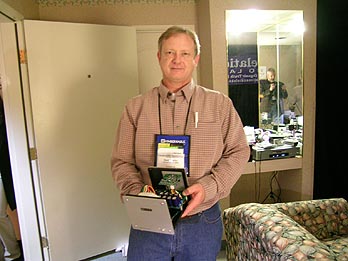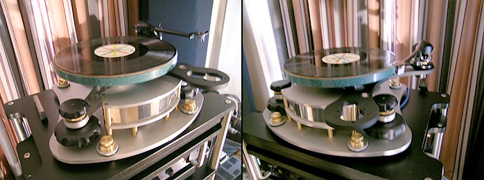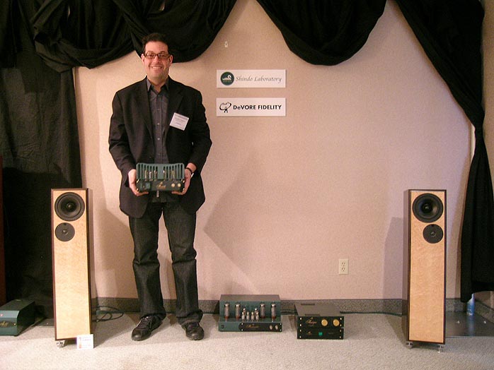 Placed unusually close to the wall in a near-field long-wall setup, the Super 8s enchanted with colossal depth of field and full-range bass extension when employed in an appropriately downscaled physical space as here and driven from a choice stack of Shindo gear. That was fronted by John Tucker's modified Denon/Exemplar 3910 and a Shindo/Garrard 301 turntable. The latter [below left] had jaded Ken Kessler stop in his hurried hallway tracks to inspect this rarity up close and personal. Shindo-USA's Jonathan Halpern [above] found himself hit with a $40,000+ burglary post-T.H.E. Show. The St. Tropez hotel had failed to lock up the Monte Cristo ballroom as promised to secure his pallet for next-morning pickup. See our report for details on the theft. |