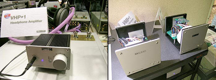 The CIA's head hit man Dusty Vawter showed off his new Channel Islands Audio headphone amplifier and two different monoblocks, one chip-based like Audio Zone, 47labs and Pastoral Audio, one Class D 'digital'. The VHP-1 [$349] is described as a versatile studio quality headphone amplifier that uses a current-feedback circuit rather than opamps and is optimized for a wide range of load impedances (30-700 ohms). Greater than 120dB of dynamic range, two gain settings, high slew rate, short circuit and thermal protection, looped-through output jacks and an external 14vAC power supply round out this unit which I've asked to review personally. |
