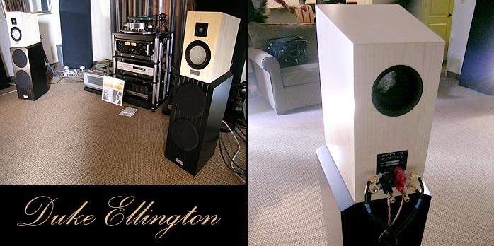 In the EAR/Mårten exhibit's smaller room, Peter Clark of RedPoint Audio Design held court with his Testa Rossa table recently reviewed by Jules Coleman while the Duke monitors demonstrated their mettle without support from the Ellingtons. |