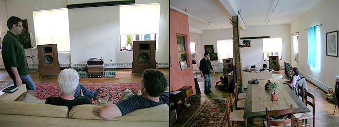 The room pix are included to convey a notion of the sheer size of this cavernous space which the 15" woofers and compression tweeters had no issue filling effortlessly. My favorite listening position was at the end of the table far behind the couch! At less than a quarter the retail of the previous system, this one boogied and had the kind of drive everyone present seemed to take an instant shine to. |