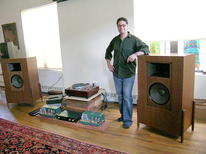 This system faced a huge open space and included the only pair of Shindo Latour field-coil speakers on American soil. Above is Jonathan Halpern smiling contentedly like the Cheshire cat after having swallowed a couple of birds in one fell swoop. That's because all of us present fell in instant love with the sound which was uncannily live-like especially way off in the far-field by effortlessly communicating across thirty feet. |