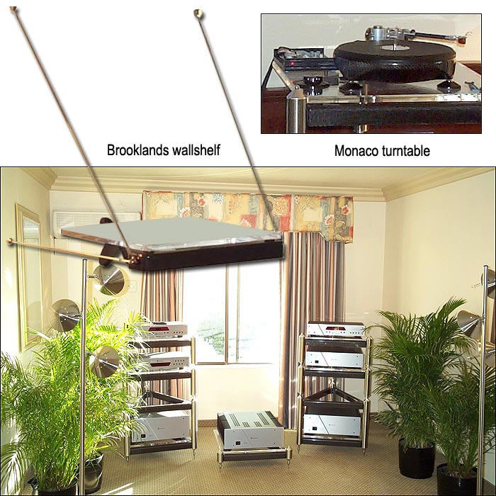 Which begs another question. What other equipment stand maker even has the expertise to design a clearly unique turntable from the ground up? Pause. By the way, introductory retail is $15,999 without arm. New also from GPA is the Brooklands wall-mount, essentially a Monaco stand for turntables that gets suspended from the wall and uses the same Carbon/Sorbothane technology as the floorstanding affair, albeit purposefully adapted to its new location. A single-tier Brooklands retails for $2,250 and each additional tier adds $1,950. Very conservately rated, max weight for the wall rack (regardless of number of tiers) is 200 lbs. |