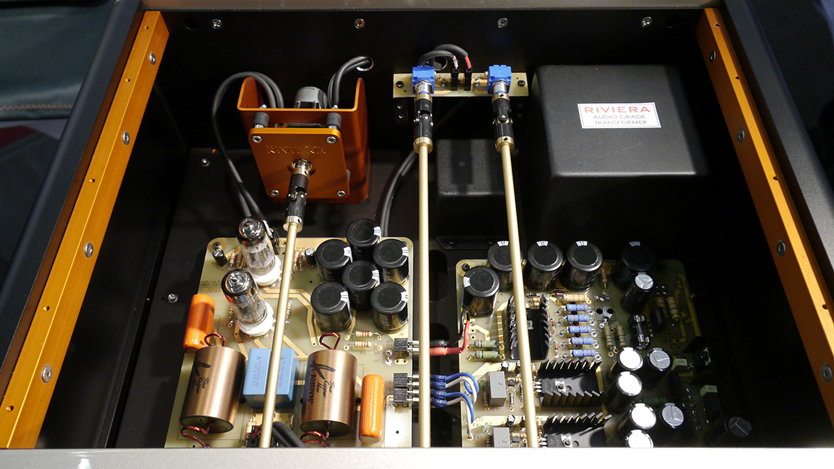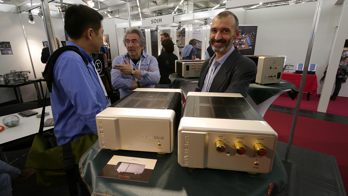 Here are Riviera Audio Labs' new 25-watt Class A hybrid monos, with designer Luca Chiomenti at right giving us a photogenic grin whilst colleague Silvio pays more attention to answering a visitor's questions just as he should have.