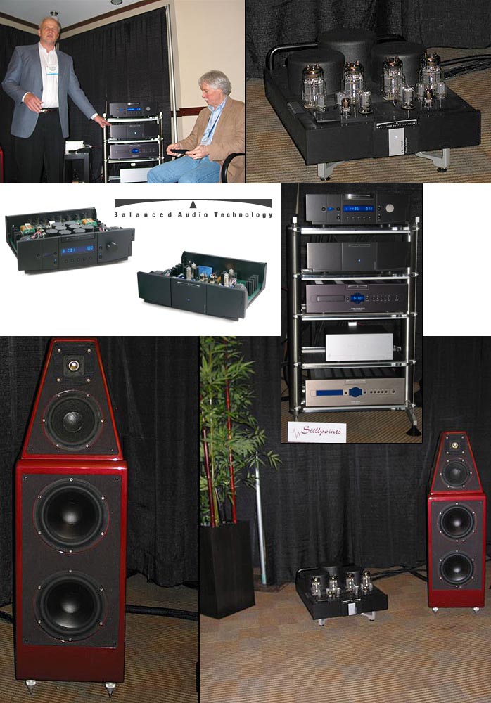 If the Dynaudio/Simaudio room represented a peak experience of sheer resolution and musicality, the Wilson/Balanced Audio Technology/Shunyata room was an oasis of musical emotion. Featuring the new Wilson Watt Puppy 8, BAT REX reference preamplifier and Shunyata Hydra V-Ray Power Conditioner, as sophisticated as the gear was (and this new preamp retailing at $18,500 features 18 tubes, a power supply for each positive and negative polarity, adjustable current source in the gain stage... sophisticated enough for y'all?), the real star of the presentation was the music. Geoff Poor and Steve Bednarski of Balanced Audio Technology are first and foremost music people for whom the experience of live music, of a true immersion in sound, is paramount - as reflected most eloquently in their products such as the exemplary VK-150SE monoblocks (single-ended triode monoblocks with 150 watts per side of no nonsense power and refinement) being employed in this demo. Likewise, Peter McGrath of Wilson, whose live hard disc recordings were showcased in a fully darkened room in which the system disappeared, to be replaced instead by live music - or so it seemed... a lovely illusion for which I would like to thank them. The experience of a piano and a symphony in that room was utterly believable. |