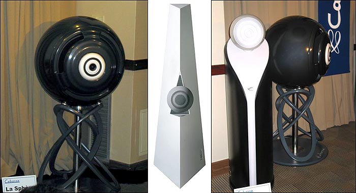 One area where we seemed to have crossed paths was in the Cabasse room, where Christophe Cabasse was introducing a new set of statement speakers, the Invaders-from-Mars-styled LaSphere. When told they were retailing for $150,000/pr, I smiled and quipped "So Chris, the Atlantis weren't expensive enough," referring to the pyramid with internal subwoofers and a tri-axial driver sitting like a giant zit on its face that I first heard at the... oh, I forget, was it the 1996 Stereophile Hi-Fi Show at the Waldorf? Lots of dynamics and a pretty amazing spatial dimension were its sonic signature and the LaSpheres behaved in a similar manner as Cabasse claims dispersion within 2dB of reference response: over a sixty degree arc for any plane, forming a perfect sixty-degree cone. Sitting atop a Tralfalmadorian nucleonic supporting stand is this immense 4-way point-source driver featuring tweeter, midrange and lower midrange elements and a 22" bass unit. No, that wasn't a typo. Each of the drivers was assigned their own separate BelCanto amp (e.One Reference 1000s I believe), four to a side, with a four-way active processor controlling crossover points and time alignment for the four acoustic centers. I didn't have much time to mess with them before the crowds and controlled demos came but despite the sheer weight of the bass, they were surprisingly dainty and spatial in their presentation. Of course, for $150,000, one would hope to get a lap dance and a villa in Lichtenstein as part of the package. |