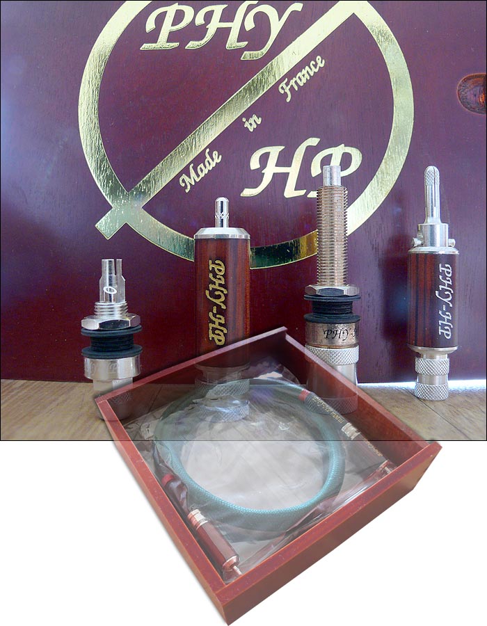 The war against MDI can't stop at the transducers. It must eventually encompass the entire audio system front to back. Accordingly, Salabert has created his own connectors -- "the world's best nobody knows about" -- which combine paper insulation (and hydrophonic cotton sleeves on the cables) with 40-micron pure silver plating to insure a silver contact with other commercial connectors where 0.2 - 0.4 microns of gold or 0.4 to 4 microns of silver are applied over a thick shiny nickel layer which, after the unavoidable scratches of insertion and removal, becomes the de facto contact material - nickel on nickel, a very bad electrical connection. PHY's RCA plug contacts for the pin and barrel sport V cutouts to make solid connections with the conductors even without solder and the pin itself is profiled with hundreds of micro pyramids to increase the contact surface on insertion. |