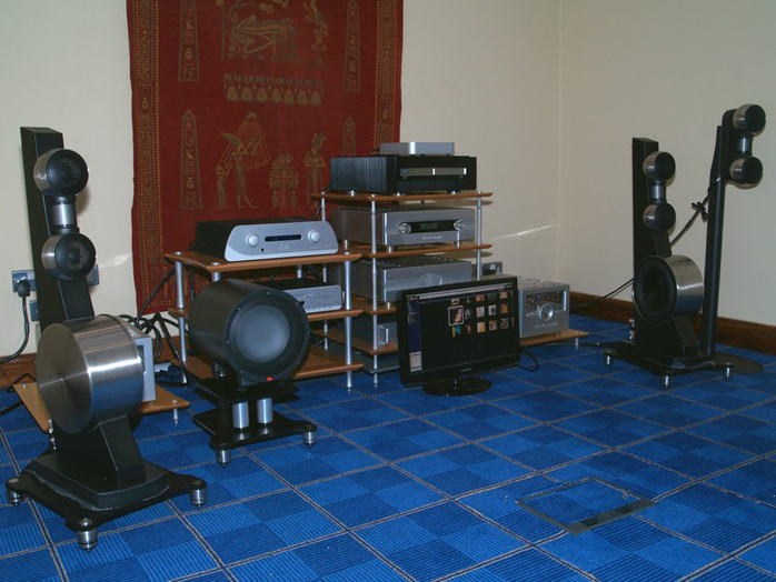 Howes quarter-wave loudspeakers. The speakers are designed for corner placement with a bass vent at the bottom and mid and treble reflected into the room by a half-cone deflector. Drive units are Lowther PM6A, PM7A or DX2. You wouldn't expect these speakers to image with the best and you'd be right but I've never regarded imaging as being of such great importance so the relaxed ethereal presentation of the Howes got a big thumbs-up and of course the Quad II's contribution shouldn't be ignored.