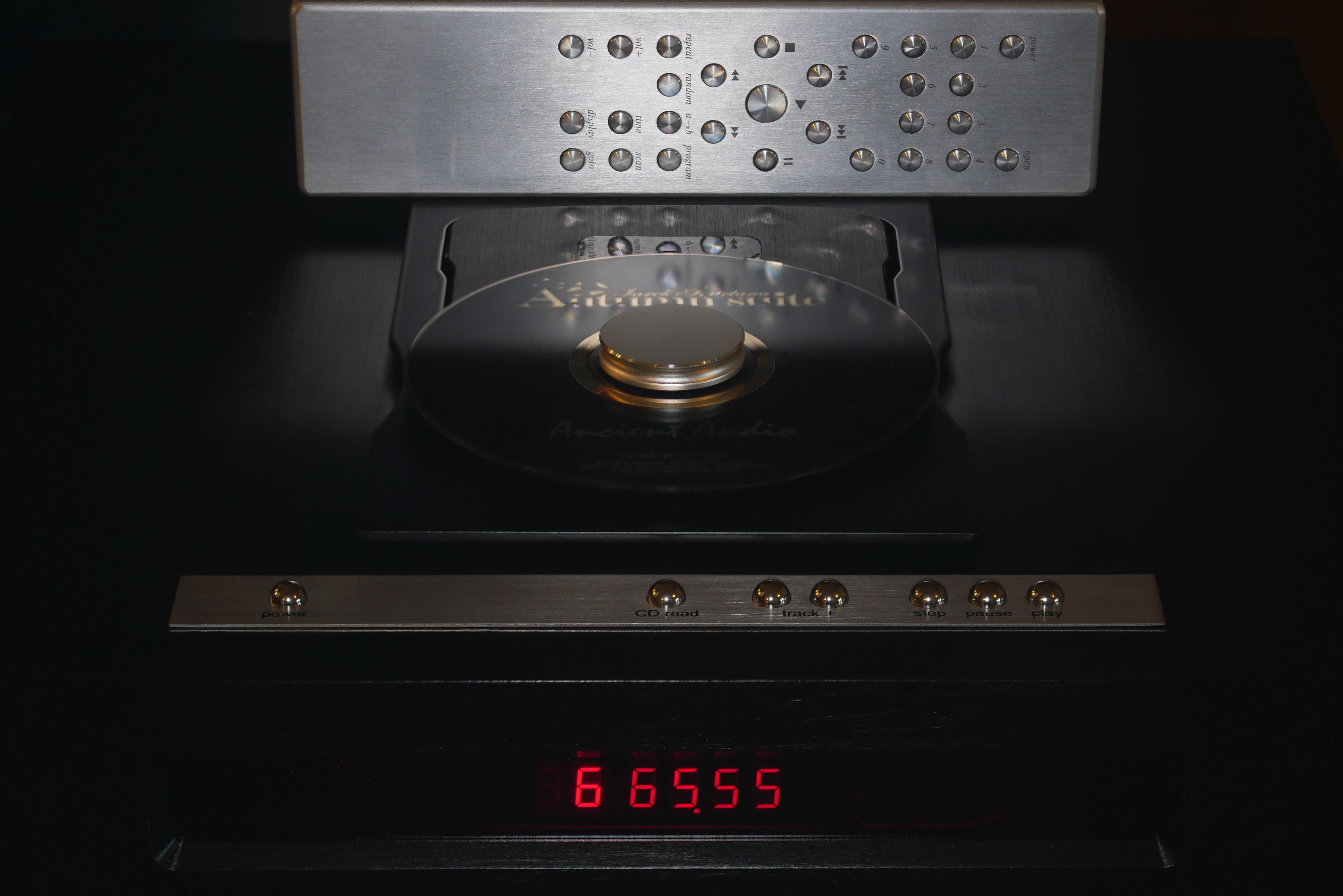 Delivery in a sturdy wood crate with foam braces proved entirely unproblematic if not the last word in unpacking chic. A full-function metal remote in silver not black was included. So was a black-faced CD with Ancient Audio logo and a small puck. This particular disc makes for an attractive dust cover. The floating transport mech is fully suspended so pushing on it shows considerable give. Hence four hard footers. Clearly this design doesn't need an extra soft-sprung suspension by way of viscoelastic supports. Also, the Taiwanese machined aluminium plinth/housing contributes considerable mass and rigidity in a very compact slab. This is a most inert affair so different from typical bolted-up box construction.