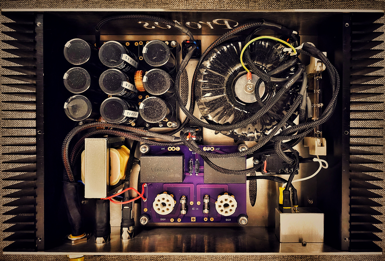 The obvious showstopper is the main unit, 60kg of sheer beauty which engaged me in almost disturbingly sensuous fashion since I first touched the ribs on its aluminium heat sinks. It has that unapologetically sculptural Aries Cerat signature. It asks no permission to be in our room but simply declares itself. The combination of colours and materials, the black glass front panel, copper-anodized bowed cheeks and stainless-steel top are a gorgeous sight to behold which matched the colour palette of my room and other gear, feeling right at home from Day One. Even the remote control combines practicality with rewarding looks and satisfying tactile feedback. It is a thick slender wand of solid aluminium which constitutes the only way to operate Protos given a total absence of knobs or buttons apart from the mains rocker on the PSU's back. The remote allows us to select source, control volume and change channel balance. The attenuator module is a 61-step switched R2R array for high precision, resolution and no channel imbalance even at very low SPL. The volume level displays with LED indicators on the front panel where source, L/R balance and L/R TriodeFet bias show as well. While the former indications can be obscured during operation, the bias information always shows with real-time fluctuations which I found mildly annoying. On the rear locate five unbalanced inputs, speaker terminals and the XLR4 headphone port. Being single-ended, the Protos topology is unbalanced by definition. Providing a transformer-balanced input would have been possible but the uncompromising approach of Stavros did not allow for that mundane concession. Although an XLR input adapter can be ordered, it's not advised when no XLR/RCA conversion is completely immune from sonic degradation. The beauty of Protos continues on the inside. When opening the top lid, the view is both unusual and gratifying. The elegance of the layout, the component quality and generous sizing of various chokes, transformers and capacitors immediately impressed this uncultured enthusiast.