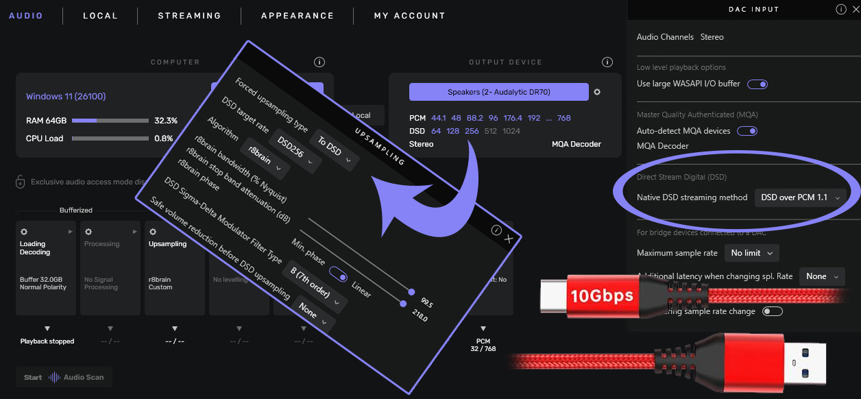 Do you like it dry or wet? I live in Ireland. So you might suspect to know my leanings. But you'd be wrong; sonically that is. Whenever I've had the option, I've always preferred drier PCM to DSD. I find it better separated, sorted, less diffuse, vague, soft and dark. On first blush this repeated itself with my new desktop Audalytic DR70, a discrete R2R DAC with 1-bit DSD path for just €399. My stuck penny only dropped days later when I realized that unless one selects DSD Direct in its basic menu, DSD converts to PCM through a FIR interpolation filter before being processed by the 25-bit R2R ladders. Katchinnng! When meeting the proper 1-bit low-pass filter, it's a very different result. Now PCM separation and articulation re-enter the building to mix it up with DSD's fruitier timbres and more billowy imaging. Whilst Luxsin's X9 Asahi Kasei combo of AK4499EX converter and AK4191EQ digital filter/modulator too offers native DSD512 support, it never stirred any personal lust. That had DSD drop off my to-do list. Though I'm not sure why one would pursue a discrete R2R DAC to not use its ladders but 1-bit modulator, that's precisely wet I've been up to¹. John Darko too had his come-to-D(SD)addy moment when he experienced his Gustard R30 sample in DSD512 mode via I²S off a resampling Shanling transport. I use Audirvana Studio instead.
