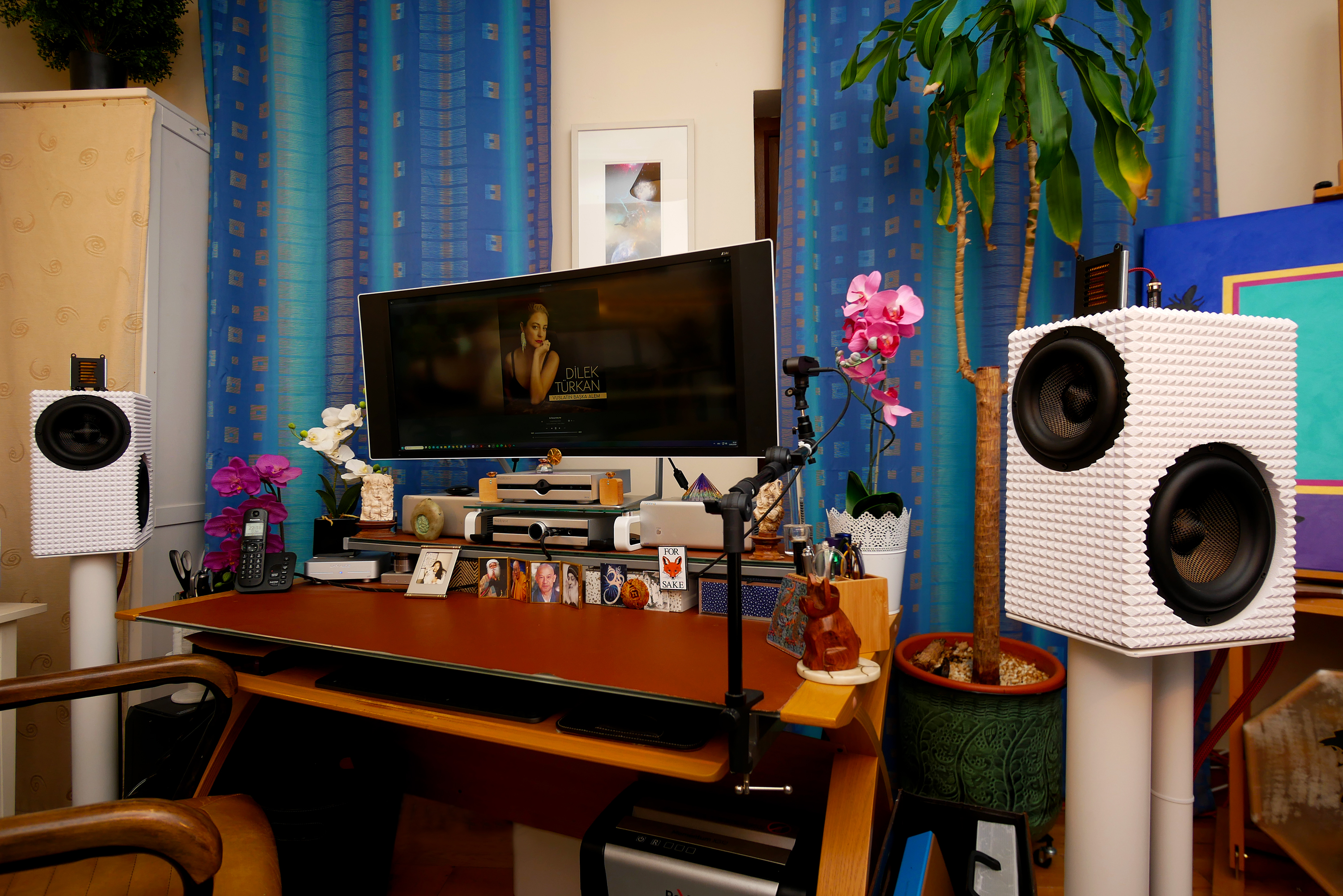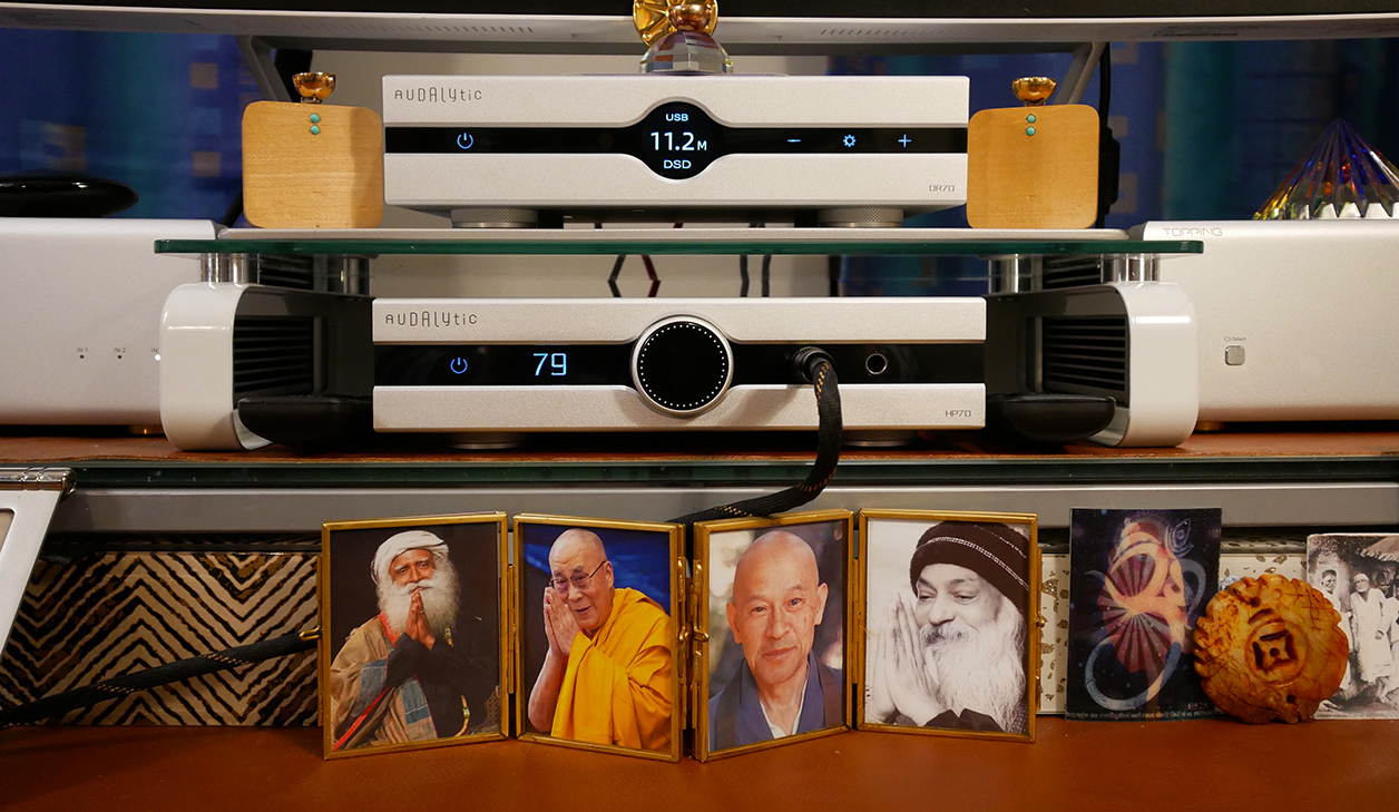 Desktop system: Source: HP Z2 work station Win11/64; USB isolator: LHY UIP; DAC: Audalytic DR70; Head/preamp: Audalytic HP70; Speaker amps: Topping B200 monos; Loudspeakers: Virtual Hifi Viper; Headphones: Final D-8000, aune SR7000, FiiO FT7