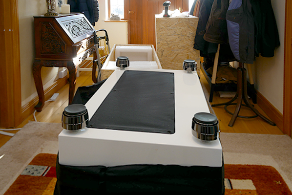 My tracker announced an inbound 80x120x110cm pallet weighing 160kg. Whatever their skin tone, these contents were clearly well fed. On the appointed day, my friendly Gavins' lorry driver acting as FedEx subcontractor pulled up to drop off two wooden crates. From them quickly emerged two white samples—hurray!—and a separate small box containing the isolation footers plus alternate spikes and floor protectors. These viscoelastic IsoAcoustic footers are directional. Per their instructions, the writing on them should face the listener. As you see, the big opening of the quarter-wave tapered guts covers with thin black grill cloth. This prevents spiders, ants and other critter colonies from setting up shop. What do you call a 100-year-old ant? An antique! No such petrification here.