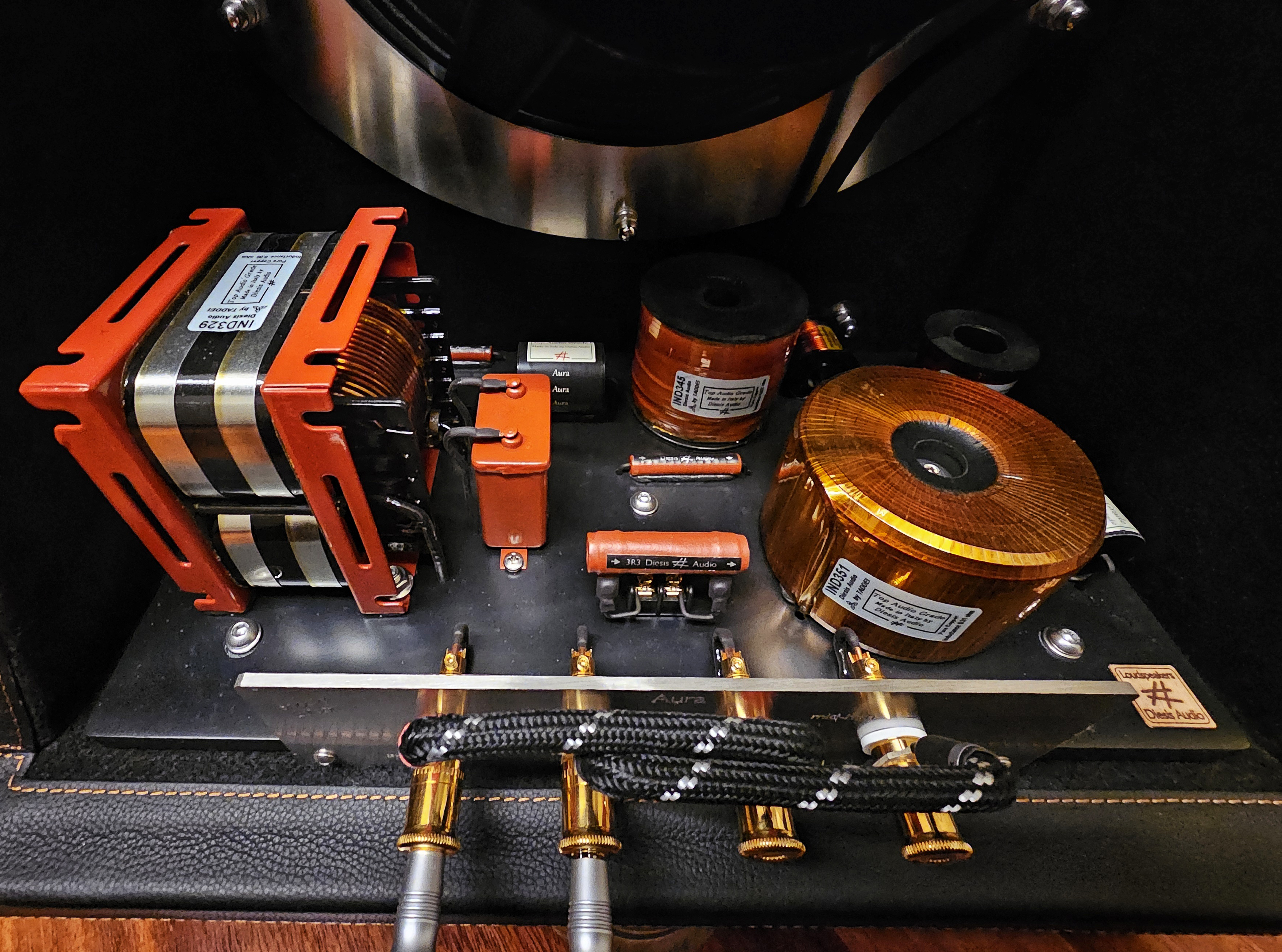 As explained, the ability of being driven by modest power is a primary objective for all Diesis speakers to facilitate SET amplification as favoured by Giuseppe. With an efficiency of 93dB/2.83V/1m and a nominal 6Ω impedance, Aura presents a manageable though not easiest load. Minimum recommended amplifier power is 20 watts. The bandwidth splits into a 3-way crossover whose design and component selection are crucial. This filter network is another astonishing example of attention to detail and extreme craftsmanship, featuring free-air point-to-point connections and big parts with no expense spared or limits imposed on size or material makeup. The 12" woofer enters below 200Hz, the 10" unit filters around 1'800Hz, leaving the horn-loaded compression driver significant bandwidth. Consequently horn geometry, material, manufacturing tolerances and final paint along with choice of driver are critical to the overall presentation. Diesis offer the option to customize the balance between horn driver and woofer section by providing a 47Ω resistor as an alternative to the default 33Ω. This adds attenuation.