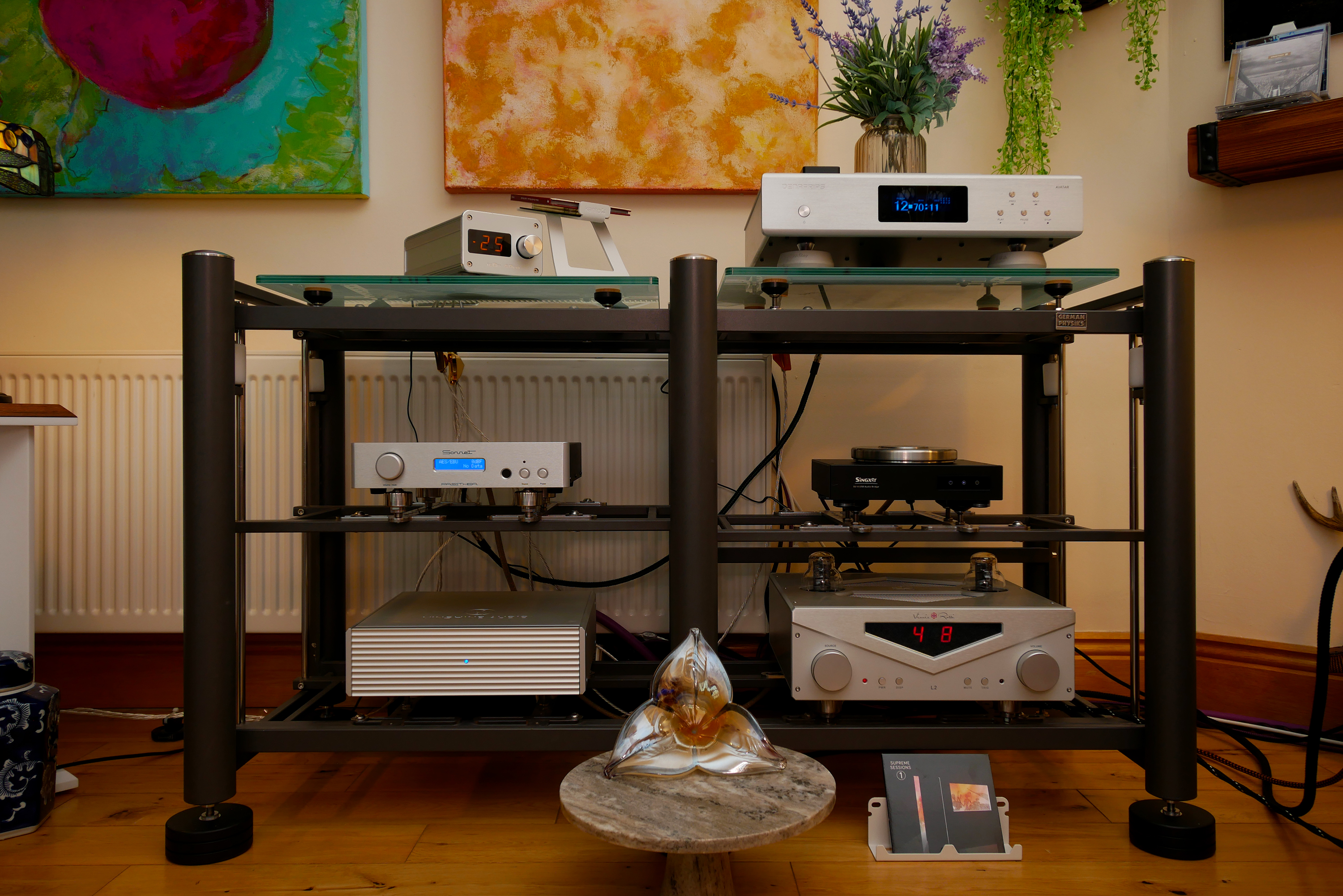 2nd upstairs speaker system: Source: FiiO R7; Integrated amplifier: Simon Audio Lab i5; Loudspeakers: ModalAkustik Musikboxx with Dynaudio S18 subwoofer