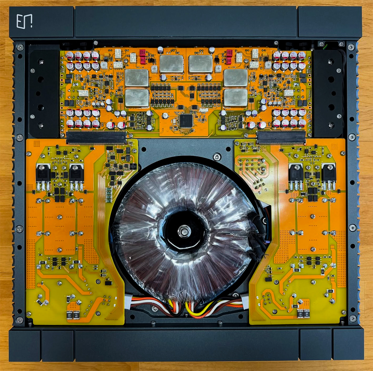 Thinking readers appreciate that 115wpc/8Ω from this compact chassis would turn the entire casework into a heatsink so cook very hot in pure class A. Adaptive bias meanwhile tracks the input signal in real time then dynamically reacts to actual power demands. This relies on very fast processing speeds to avoid any time lag whilst purists might still call it a mere approximation of class A. Krell of yore referred to their implementation of sliding bias as plateau biasing, Technics had their 'new class A'. Today's Chord Ultima 5 might still use a sliding bias scheme as could Schiit's Continuity output stage. We note that over time a number of designers endeavoured to harness the sonic advances of class A whilst reducing the concept's well-known inefficiency. Enleum now formally joined their ranks. For the AMP-23R, Enleum's marketing still focused predominantly on their Ensence circuit as their evolution of Bakoon's original Satri current-mode gain circuit. For the AMP-54R, their latest-gen bias controller has moved deeper into the spotlight and leverages advances in its 32-bit CPU to run the new tracking algorithm for greater precision, more stability and higher power output.