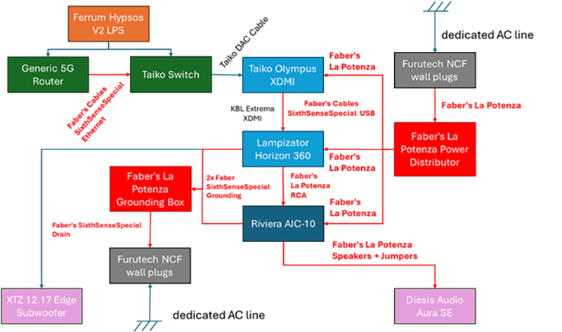 The methodology I used to conduct this complex test was to add a cable at a time, listen, then move to the next cable until the full loom was complete. I wanted to let the sonic changes and most importantly my reaction to music playback sink in. Therefore quick swaps were only an exception when something did not sound right which happened a few times. After some weeks of living with the Faber's-dominated setup, I reverted at once to the pre-Faber condition. Finally, based on the results I revisited some intermediate stages where only some of Faber's kit was present. The insertion of Faber's Cables and Faber's Power was strategized according to Fabrizio's advice by following the electrical signal's travel through the system: