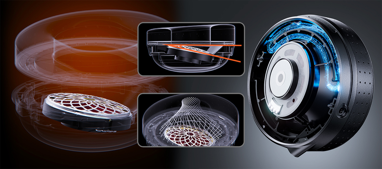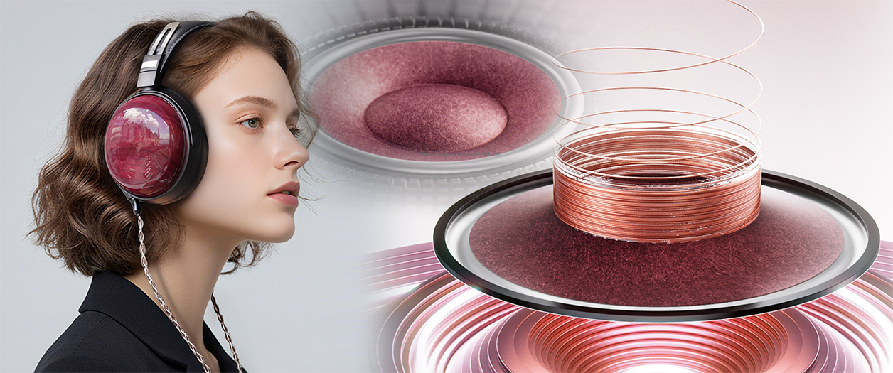 The over-sized 60mm dynamic driver uses a W-shaped 0.1mm thin cellulose pulp of Nordic Birch reinforced with carbon and wool fibres. The 25mm voice coil uses ultra-thin 0.035mm Japanese copper-clad aluminium wire on a lightweight polyimide Kapton former to maintain low moving mass for 98dB/mW sensitivity at 32Ω. To lower wear weight to 356g, the lambskin-upholstered bridge uses die-cast magnesium alloy with a ball-bearing 38mm long slider arrangement. Claimed bandwidth is 7Hz-40kHz and the included Furukawa hybrid copper/silver cable is 1.5m long terminated in twin 3.5mm for the cups and a 3.5/4.4mm swappable amplifier end with 6.3mm and XLR4 adapter included as are real leather and textile pads to change the tuning. As shown, the driver mounts at an angle to more directly aim at the ear canal whilst a foam insert behind the driver acts as additional rear-wave absorber. The two available high-gloss lacquer finishes are "freshly oxidized" deep purple or "UV aged" brown.