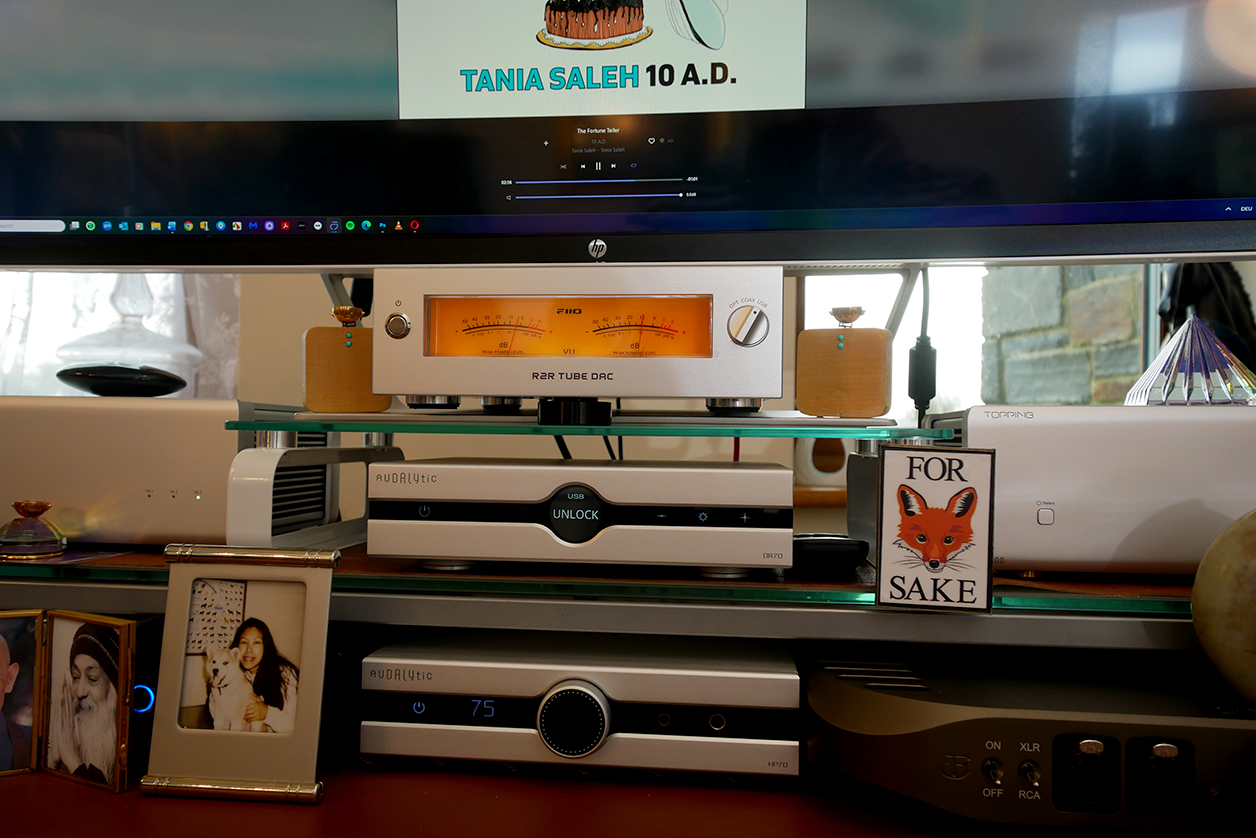 Having secured a Warmer sample from its 1st production run, by then John Darko's review had long come and gone. To extrapolate, "countering my expectations, this isn't a buttery euphonic DAC; not like the aforementioned Pro-Ject CD player… True to its name, the Warmer R2R runs physically warm: 50°C… Who should buy it? Anyone whose current DAC sounds thin and reedy; who listens to a lot of 80s music, is deep into 90s and 00s indie rock and loves analogue VU meters. Who should look elsewhere? Anyone already running a warm-sounding amplifier or rich-sounding headphones or loudspeakers. Stacking warmth on warmth rarely ends well. Anyone wanting headphone outputs. The Warmer R2R has none. FiiO's K11 and K13 which use the same in-house developed R2R architecture serve that need better and sell for less… This tubed-up R2R DAC won't be everyone's flavour but it will be someone's flavour. Think of it as a lens for your mirrorless camera with a permanently affixed diffusion filter. The filter softens the clinical edges and adds a touch of warmth to the image. FiiO's Warmer R2R offers a 'tube' infusion that isn't common at its price point. For listeners frustrated by the ectomorphic¹ sound of their current streaming setup, €379 buys a meaningful tonal correction and some genuinely lovely meters." Would my ears sign John's findings with 'as he said'? My desktop's Topping monos are the antithesis of warm and rich. They emit no fireside vibes. It's my Polish Viper speakers with their long-throw carbon mid/woofers plus V-twin passive radiators which dial up the warmth in my office. How would FiiO's own temps bed in versus my Audalytic DR70's 1-bit modulator receiving DSD256 through Audirvana's r8brain resampler? Again, both that and the fixed-out FiiO in PCM mode would output to the Audalytic HP70 pre/headamp with analogue volume control and XLR outputs. I bypass the built-in MeanWell SMPS of both baby Gustards with 15V DC feeds off a LHY Audio LPS-80 Dual linear power supply.