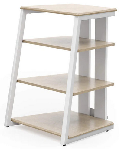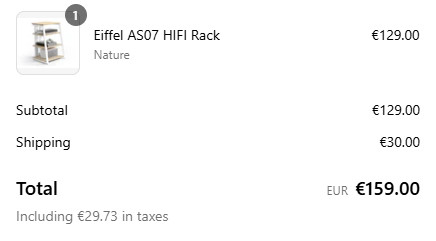 My ideal el cheapo rack must only tick off 43cm component width with minimal extra breadth and depth to not sit too proud off the sidewall next to my IKEA rocker; four shelves; solid load limits; and a contemporary look preferably in white with blond wood. A quick finger walk from John's link to the model page spots that very finish option. €159 includes VAT and shipping. EU order fulfillment is a warehouse in Germany's Langenfeld. Shazam. I smash the 'do me' button like YouTubers beg us to subscribe to their channel.