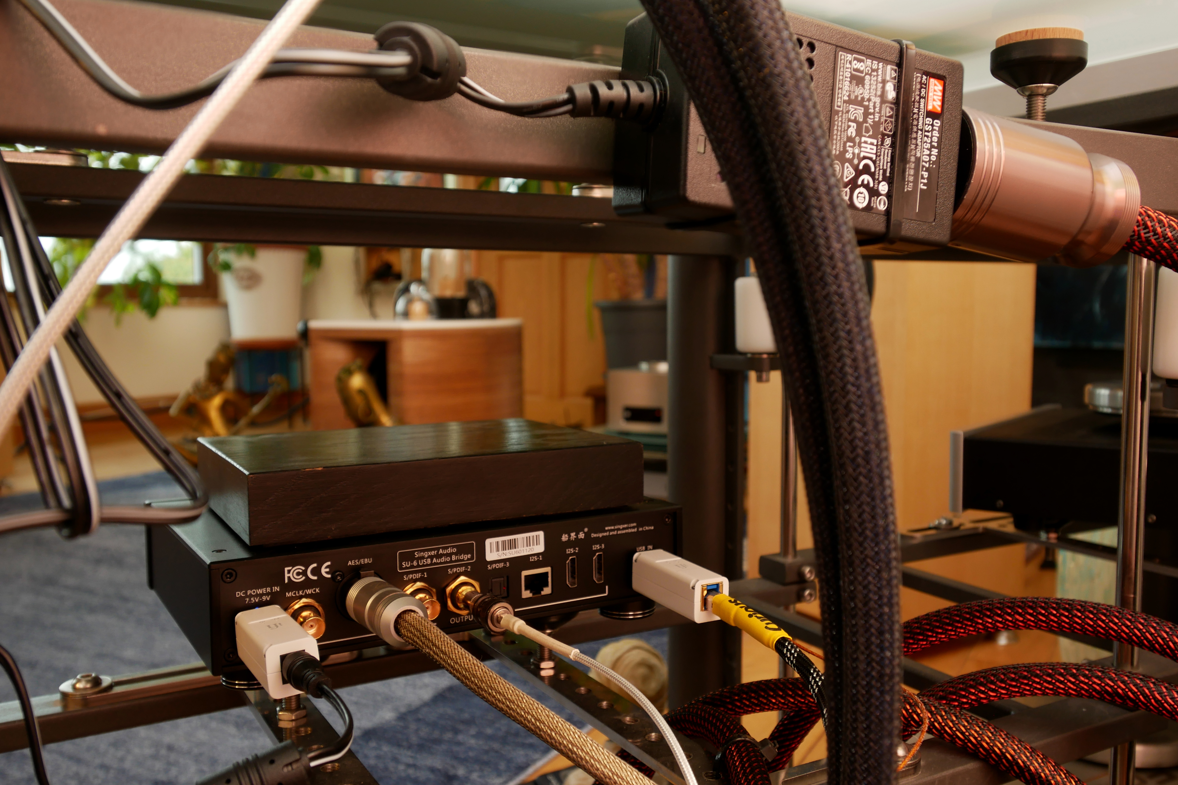 Here's the back end of the Singxer SU-6 USB bridge. Note its quite sizable Meanwell AC/DC adapter strapped to the rack's top cross bar. Unlike the router's, that switcher had no issue with the iFi whose power-on LED lit up red in confirmation, not its red polarity warning. By using US-style power distributors, I can't get power polarity wrong unless a wall socket miswires. This photo might serve as reminder for the DC iPurifier2's raison d'être. Rather than invest in a linear power supply of the correct voltage/amperage values whose classic power transformer might still hum, we get to keep our mechanically quiet switcher yet prevent its HF switching noise from flooding the component it powers. Sourcing a quality linear power supply for iFi's coin should be one very long day at the office. That's not to imply that a 'dastardly' switcher couldn't be sonically trounced by a 'white knight' linear job. But not all switchers are throwaways; and quality components might actually use galvanic isolators on their DC input to play down any ill effects.