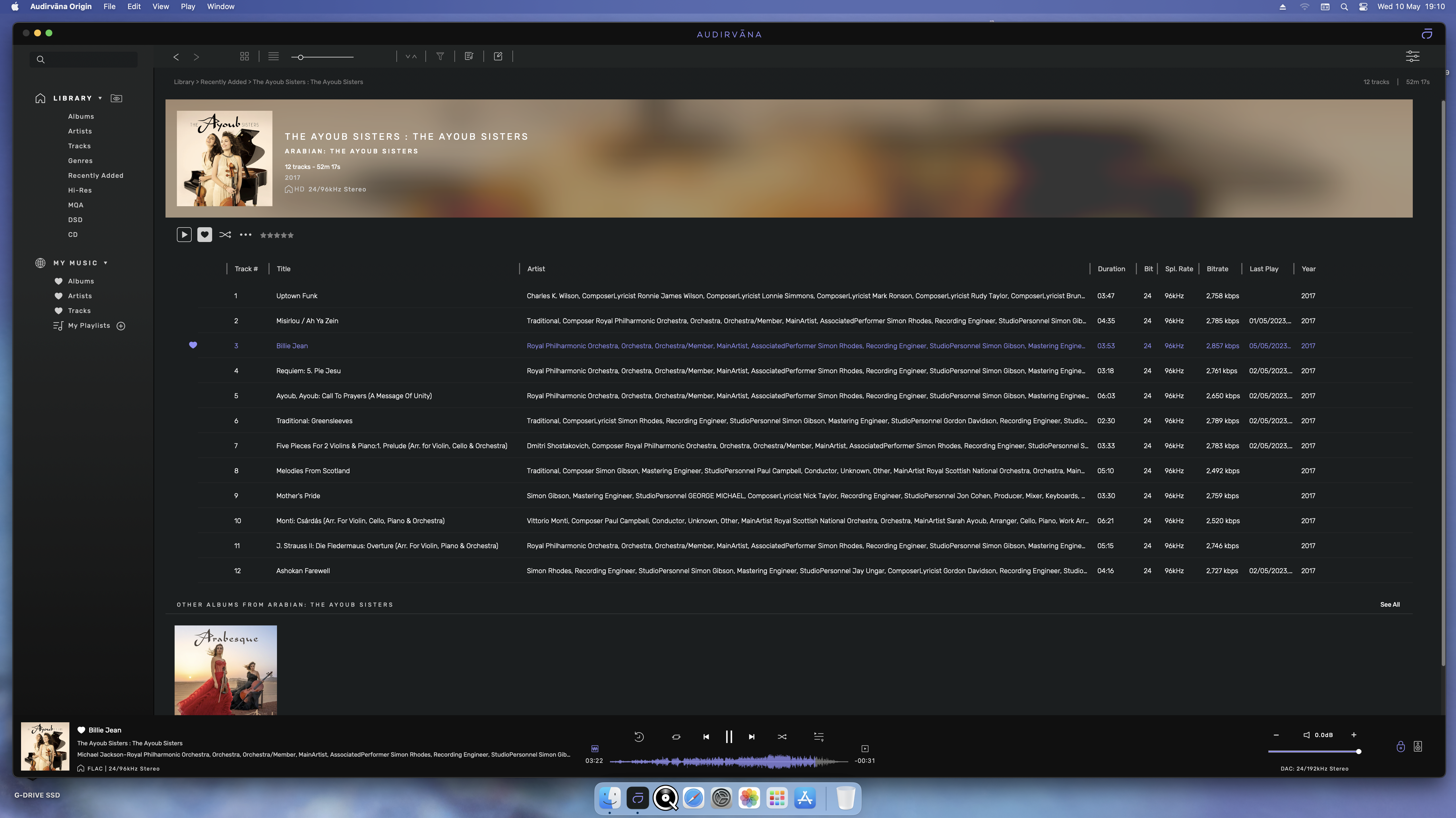 For a telling track I cued up the first album from the Ayoub Sisters then the surprising instrumental cover of Michael Jackson's "Billie Jean". Enlarge the next screen shot with the mouse-over loupe. Check out what proper recorded dynamic range looks like in the purple track progress bar at the very bottom. If you set your volume relative to how quiet the track begins, you'll jump for the remote once it gets past the halfway mark. That's what properly mastered music looks like. If instead you see one big solid bar, it's been dynamically compressed to death; unfortunately today's norm. I deliberately set my starting SPL slightly high then focussed on bowed string tone during the now rather loud bits. Because on massed strings is where noise pollution really shows its teeth.