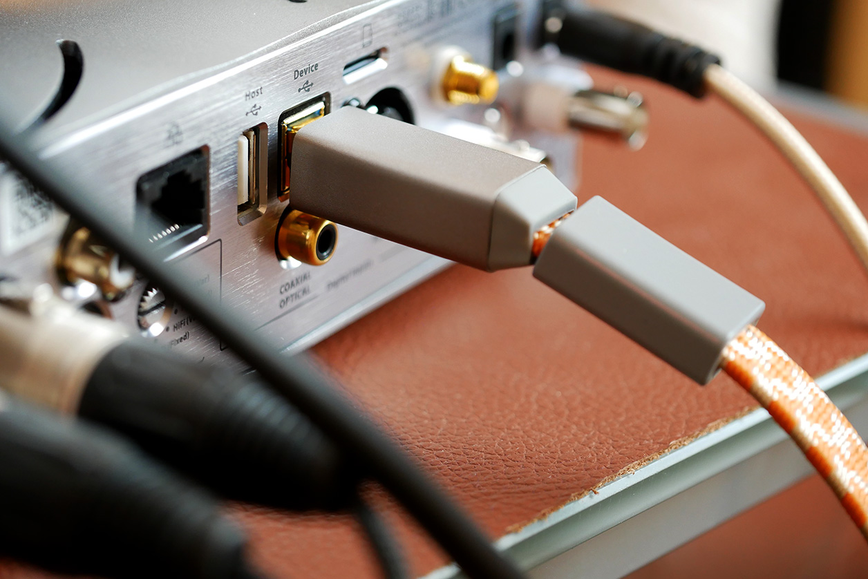 Unexpected part of the delivery was a short pigtail to convert the cable's send end to USB C. Nice. The three silver-grey barrels along the cable slide freely. They aren't formal dress bits but "custom metal-oxide ceramic filters which broaden the range over which RF noise is silenced. The middle silencer can move along the whole length of the cable to 'detune' the antennae formed by the cable. The other two silencers should be kept as close to each respective end as possible." As expected, USB 3.0's bigger B plug made a firmer more reassuring connection than the USB 2.0 plug it replaced. That presumably would also keep my contact resistance lower. As we knew from the earlier photo, Mercury3.0 is a ribbon cable whose eight spaced "quadruple shielded" conductors lay out parallel and conform to the 90Ω standard. And that's all our tech fairy has on this cable. It's a very distinctive build that was clearly different from anything else I had on hand now. To my mind in fact, it expressed a comprehensive engineering ethos with none of the "tuned by ear, entirely made by hand" aura typical of boutique brands which expand from standard 20Hz-20kHz cables to high-speed digital types with little to no regard for RF implications and impedances.