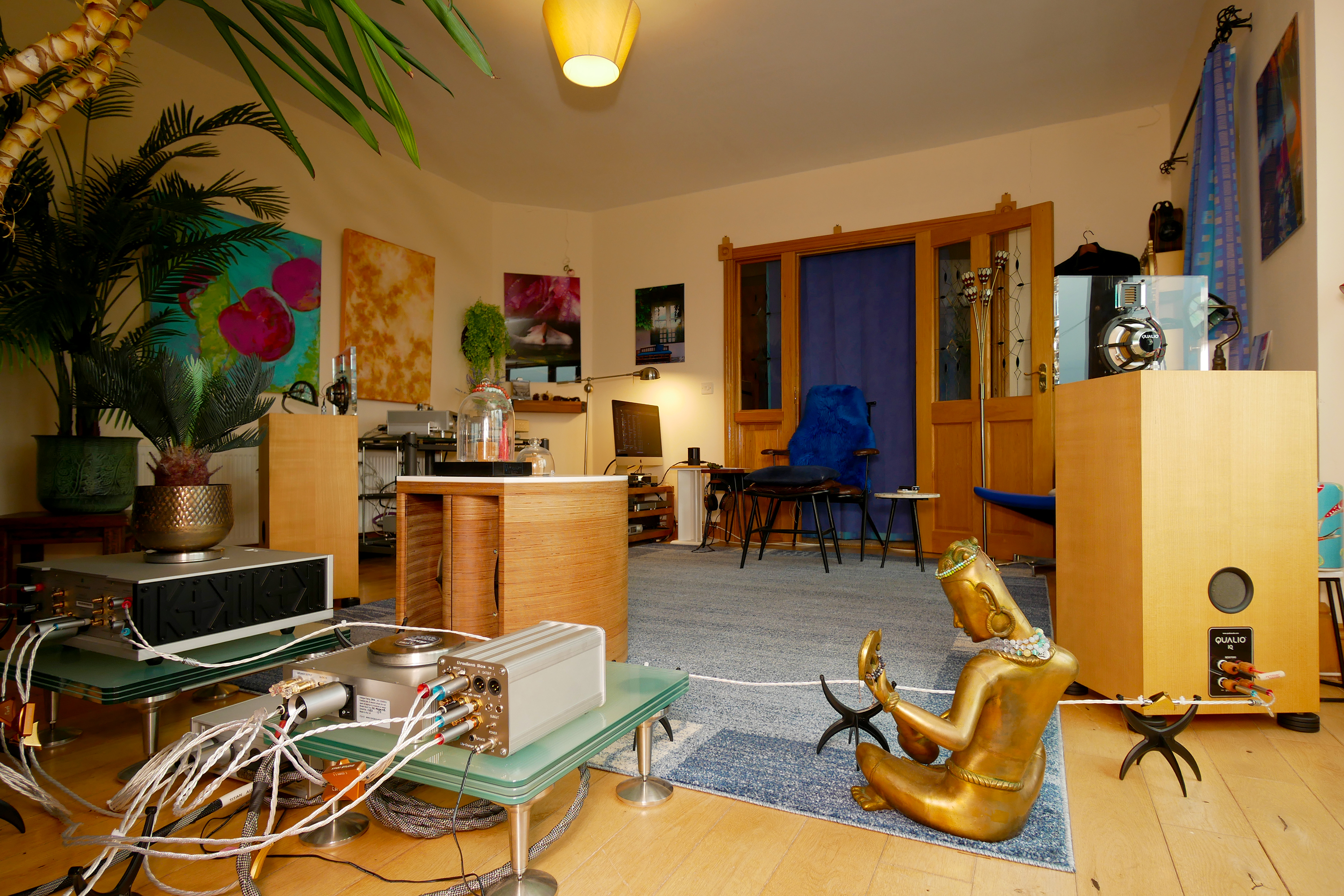 Main system: Sources: Retina 5K 27" iMac (i5, 256GB SSD, 40GB RAM, Sonoma 14), 4TB external SSD with Thunderbolt 3, Audirvana Studio, Qobuz Sublime, Singxer SU-6 USB bridge, LHY Audio SW-8 & SW-6 switch, Sonnet Pasithea, Laiv Audio Harmony; Active filter: Lifesaver Audio Gradient Box 2; Power amplifiers: Vinshine Audio x Kinki Studio Dazzle & Gold Note PA-10 Evo in mono on subwoofer; Headamp: Enleum AMP-23R; Phones: Raal 1995 Immanis; Loudspeakers: Qualio IQ [on loan] Cables: Exact Express Flame, Furutech; Power delivery: 2 x Kinki/Vinshine Tai Hang on amps and source stack, Furutech DPS-4.1 between wall and conditioners; Equipment rack: Artesanía Audio Exoteryc double-wide 3-tier with optional glass shelves, Exoteryc amp stands; Sundry accessories: Acoustic System resonators, AudioQuest FogLifters; Room: 6 x 8m with open door behind listening seat; Room treatment: 2 x PSI Audio AVAA C214 active bass traps