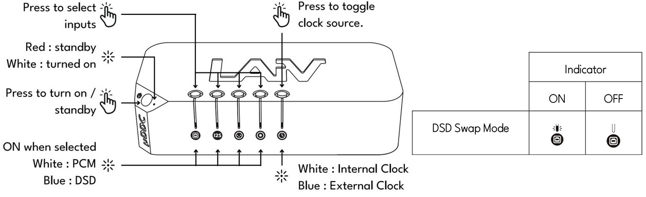 Yet the owner's manual has no better advice than trying out the above modes by ear. If nothing works, it's refund time. Because Micro lacks a display, visual confirmation is by LED pattern as shown, access to this and the DSD swap mode via a long button press then light colour change on the I²S or USB input selector. We do this once then never again unless our DAC changes. This certainly wouldn't justify a display, menu access and their associated extra costs. Wiring Micro into Laiv's Harmony DAC creates an automatic I²S handshake, no mode trials required. With Harmony my only current DAC in use which sports I²S over HDMI, I enjoyed an automatic perfect lock.