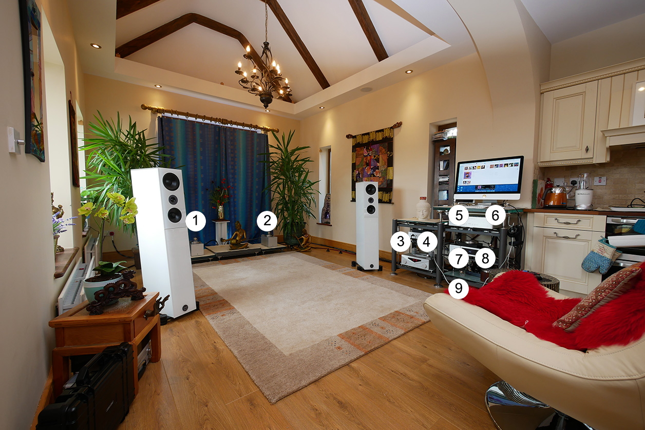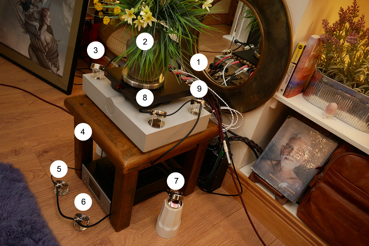 Downstairs I began without the discs to have my clear base line. Then the lot installed. Seven wired up on the source rack, one each without ground lead sat atop the amps. This netted two fronting the music iMac, two atop the USB bridge, two atop the DHT tube preamp, one facing the Vibex AC/DC filter. Over about 15 minutes, the effect showed up in full. Its magnitude was greater than upstairs N°2, not as great as upstairs N°1 had been. Again tone/texture grew more honeyed. Pace mellowed, timing gained elasticity. Again contrast made me conscious of a peculiar action whereby sounds didn't just passively rise between and behind the speakers but rushed toward me. Physically I sensed the BBs' radiating effect in my belly as a slight warmth. Once they'd become the new normal, I expected that sensation and the 'more active air' perception to recede from awareness. Right after the switch, their otherness still registered.