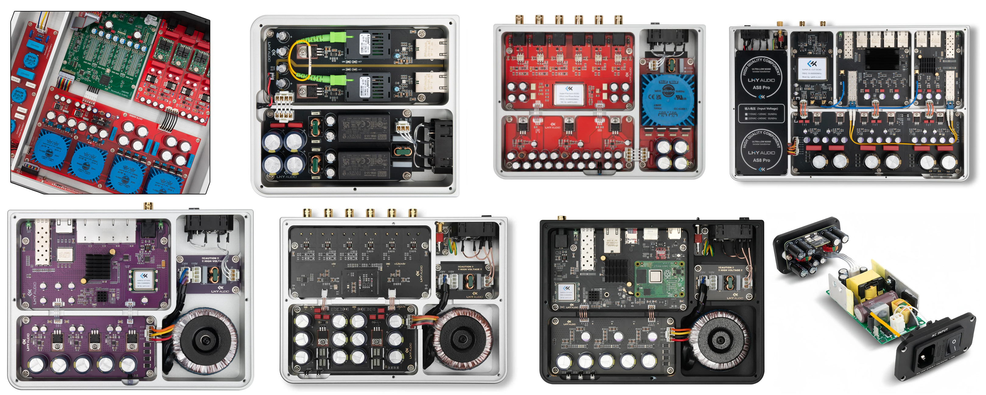 After all, we don't want just power. We already have that. We want premium power of ultra-low µV noise with very low Ω. In LHY Audio's case by way of "what else", below is a sampling of other kit in their roster; including the discrete R2R DAC top left under the Jay's Audio banner. The power supply to the lower far right configurable for up to 24V/3.5A is a switcher for a change, something this engineering team can do as well where small size and a $130 budget matter. The network switch second from the left in the upper row uses dual MeanWell SMPS from Taiwan instead of linear power.
