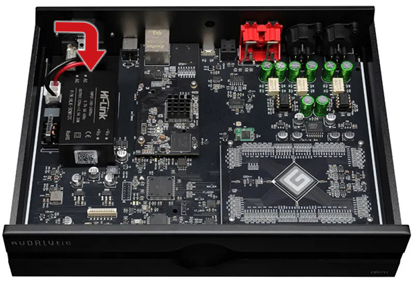 For a clear look on what the LHY replaced, this red arrow points at one of the switching modules. It's roughly the size of a box of matches. This DAC would need to be twice as tall to build in a lower shielded storey à la Denafrips and contain my new 80W linear power supply. That would make it easily twice the price. In short, all is right with the DR70 as is. I was simply curious whether its performance could still be boosted.