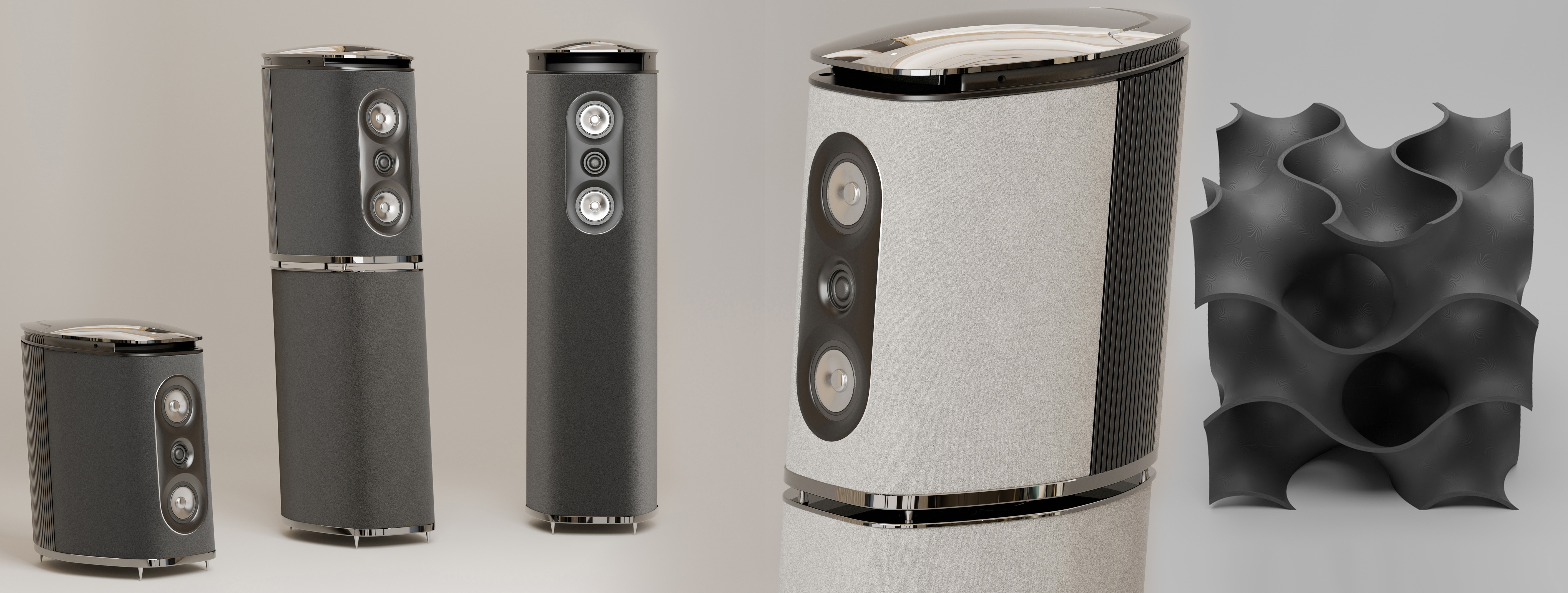 When the jury returned, the verdict read pure in-house development without Mr. Ellis consultancy; and two models, the Atom 525 monitor with optional stand; and the Atom 650 floorstander. "Both employ our proprietary patented Helical Transmission Line system, extending bass response far beyond expectation for their size. HTL directs the output of the long-throw woofer into a central chamber, driving a helical passageway that reinforces and projects low frequencies with authority and control. Atom also introduces our patented MonoCell damping made possible by additive manufacturing. This rigid lattice structure replaces traditional fibrous damping, doubling as infinite bracing to create an ultra-stiff monocoque enclosure. The result is a dramatic reduction in cabinet-borne coloration and a purer more transparent presentation. Every element of these enclosures is engineered for acoustic integrity. The sculpted cabinets eliminate sharp edges and flat surfaces that compromise stereo imaging whilst the close alignment of tweeter and dual midrange drivers preserves soundstage coherence in both the horizontal and vertical planes. Ultra-lightweight midrange drivers without a traditional spider show improved clarity through mechanical freedom. The cabinets are wrapped in bespoke multi-layer acoustic fabric for superior vibration control while structural components are precision-machined from billet aluminium and polished to an immaculate decorative standard."