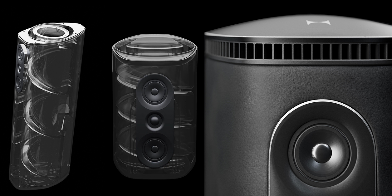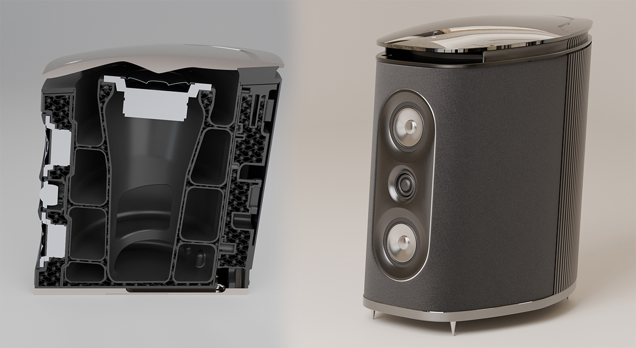The 525 monitor measures 45 x 28.5 x 36cm HxWxD and is a 4-driver 3-way transmission-line design with a 5¼" internal woofer whilst the 650 floorstander scales to 97 x 28.5 x 38cm HxWxD to lengthen the internal line and increase the woofer to 6½". As the cutaway shows, this transmission line for the woofer's rear wave winds upward in a spiral then exists through the horizontal slot beneath the skull cap. This reimagines the Hylixa concept in a different form factor and turns the central helix axis from horizontal to vertical. As far as speaker design goes, it does rather split the atom of cleverness, wouldn't you say? The building block no longer is Hylixa's glass-filled nylon but polylactic acid aka PLA. The building process too has changed, from selective laser sintering to fused deposition modeling.