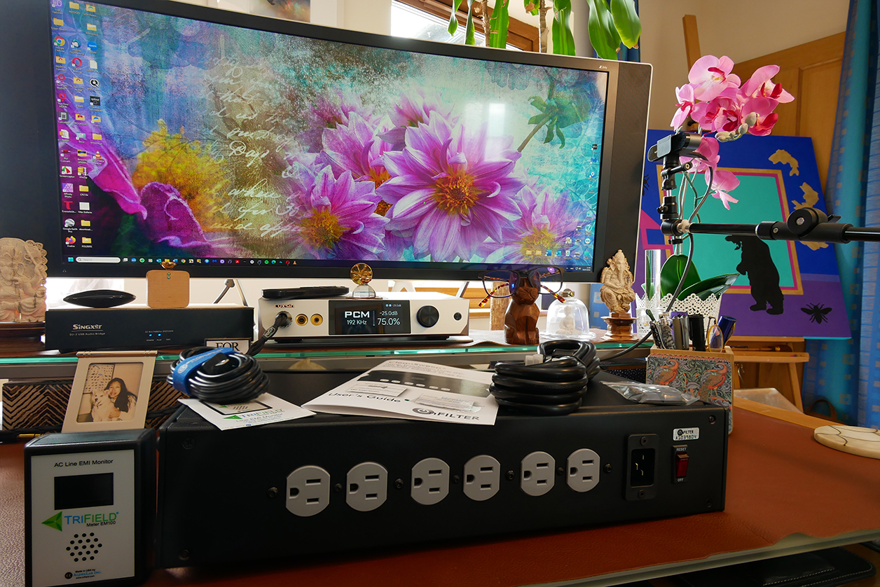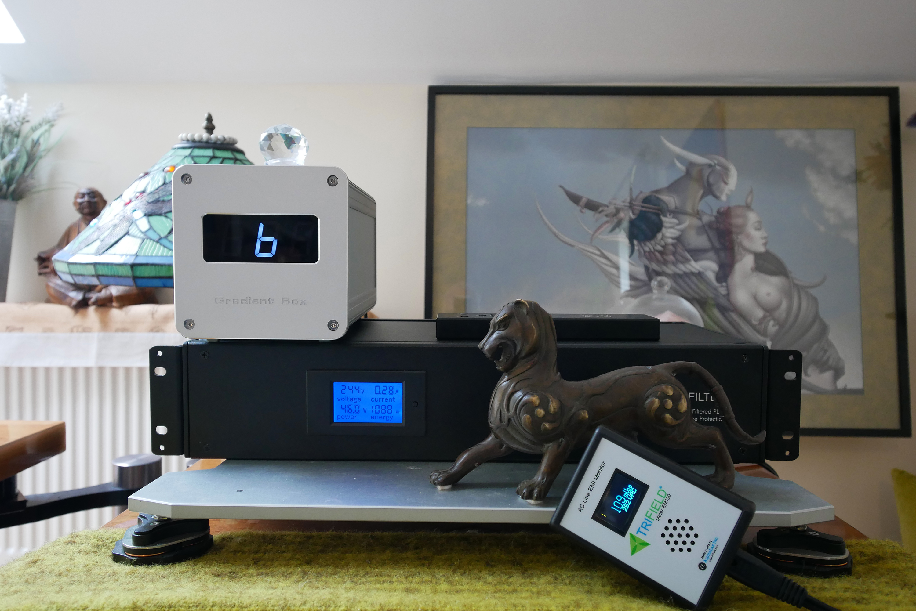 Perhaps because it arrived from the land of the brave and free where cannabis is legal and drug use rampant, I encountered 'opened by customs' tape on both the outer and inner cartons but no other evidence of disturbance. My package included the bubble-wrapped filter, a thick industrial 3m power cord with required 20A end and desired UK wall plug; four spare bolts; four glue-back rubber bumpers; a user's guide; and as extra the TriField gizmo with its own power cord and manual. Fitted with a number of tamper-proof bolts, the OnFilter innards clammed up like Dracula on a sunny day. Two 'warranty void if seal is broken' stickers on the belly reinforced Count Vlad's insistence on leaving his guts alone. How to critique his proverbial black box from an audiophile perspective?