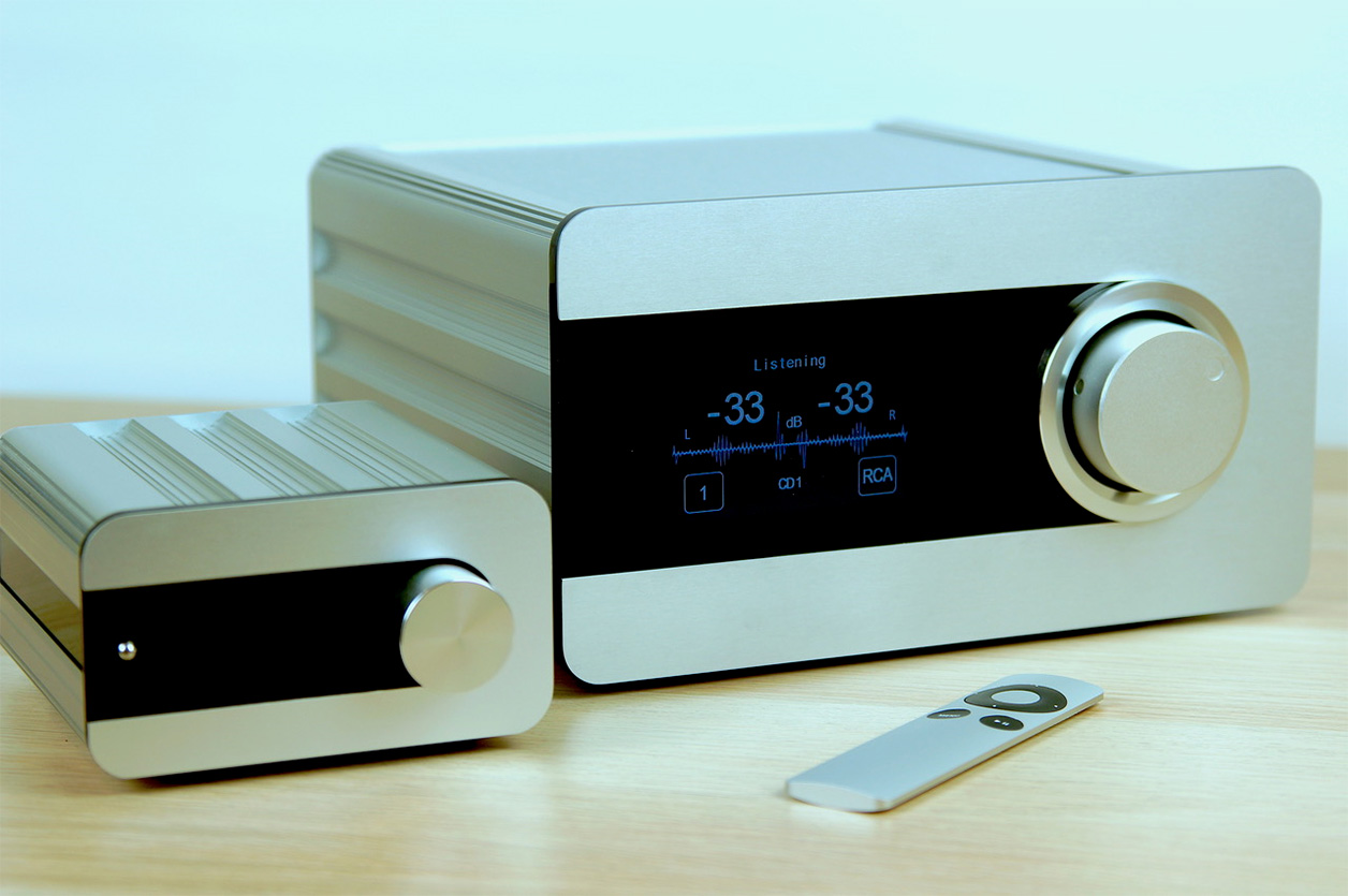 Meanwhile a modern feature set includes a metallic touch sensor on the front panel whereupon a short finger tap switches inputs, a long tap mute/unmute, a short + long night-mode on/off, 2 x short sleep mode on/off, 3 x short display bright/dim, 2 x short + 1 x long low/hi encoder responsiveness.