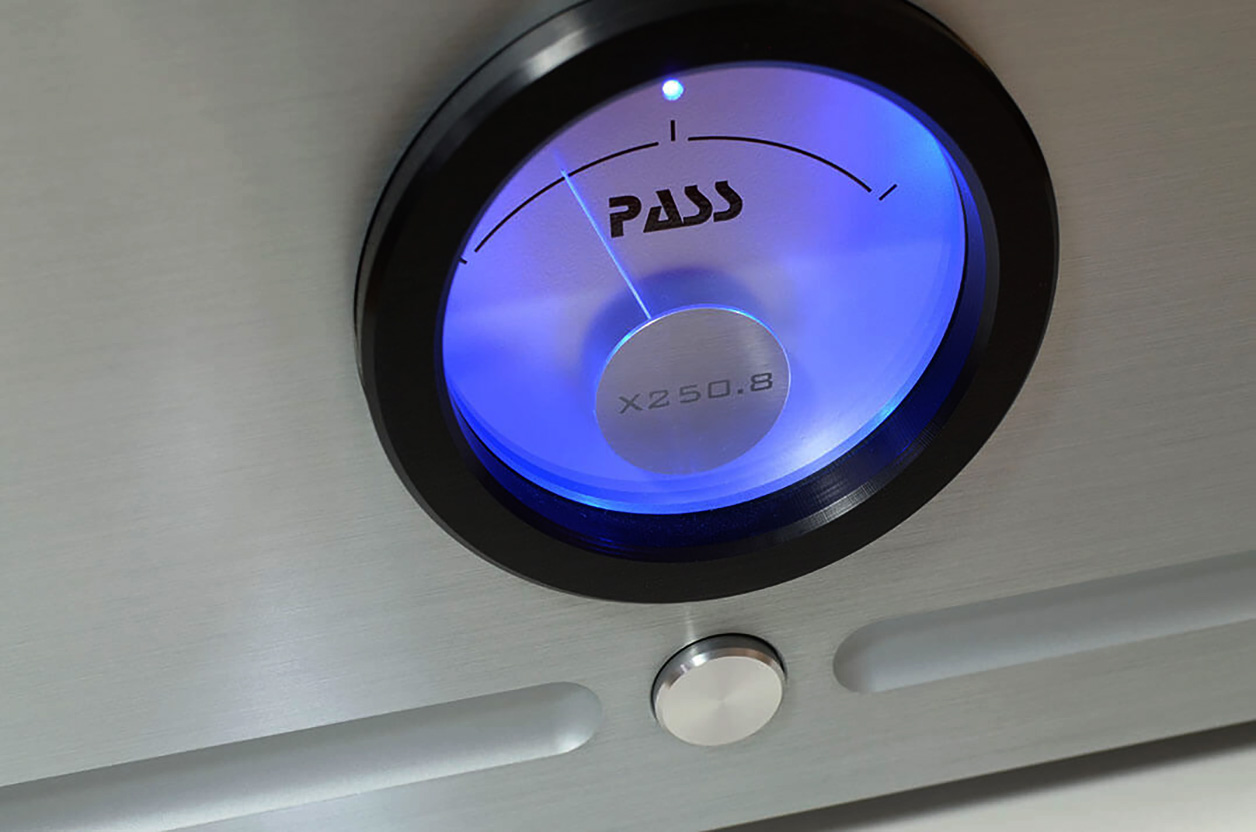 The X250.8 obviously differs. Its standby button hovers right below the central blue-lit window with its lazy needle. That's because it draws ~295 watts compliments of 56 precision-matched output Mosfets. Whilst a class AB 250wpc/8Ω design (twice that into half that), Nelson Pass still runs his first 16wpc in class A. After one hour's use, my thermometer thus measured 43°C. Fundamentally, Mr. Pass doesn't pursue the absolutely lowest distortion but insists that residual distortion be of low order thus not complex by nature. He believes that higher-order harmonic distortion—K4 and above—plus intermodulation are far more detrimental to good sound. Whilst high negative feedback easily suppresses distortion percentages, it also cancels gain. That leads to the need for additional gain stages which according to Pass create more complex distortion artifacts. His favored solution thus is higher class A bias with lower feedback and fewer gain stages.