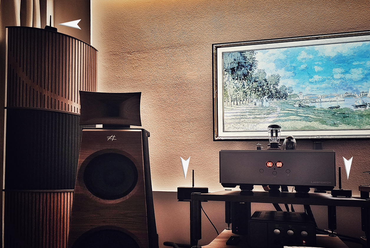 The latest generation Schnerzinger giga cancelling Plus+ is the result of years of experimental and theoretical development in the field of electromagnetic interference control. The system addresses an exceptionally wide frequency spectrum from low-frequency mains disturbances up to the three-digit Gigahertz range, thus capturing high-frequency emissions such as those found in radio, radar and highly integrated digital technologies. Unlike established suppression methods, giga cancelling Plus+ completely avoids the use of energy-storing components such as capacitors, accumulators or conventional frequency-selective filters. This eliminates system-related effects such as delays, phase distortions, bandwidth-dependent impedance changes and limited current delivery capability which are unavoidable in conventional filter concepts. Interference reduction is achieved through active interference cancellation. The combination of high temporal resolution and exceptionally wide effective bandwidth fundamentally distinguishes giga cancelling Plus+ from conventional RF suppression systems and enables effective reduction of electromagnetic interference without limiting the dynamic or spectral transmission behaviour of audio systems. All Schnerzinger giga cancelling protectors operate on the principle of controlled electromagnetic interference and consist of two functional units within a device. The receiving unit detects electromagnetic interference fields in the near and transitional field of the listening environment. Depending on the device, both conducted and radiated interference components are captured. The control unit processes the detected interference signals and generates a corresponding counter signal. Through precisely defined phase and amplitude offsets, this creates local interference effects, partially cancelling or significantly reducing selected interference components. The effect is frequency and location dependent and focuses on the immediate electromagnetic environment of sensitive audio components. The goal is not the complete elimination of electromagnetic fields but the reduction of interference-relevant signal components to a technically uncritical level. The functionality of radio-controlled and wireless systems remains unaffected. The giga cancelling technology operates without high-energy or externally powered transmitters or additional external high-frequency sources. There is no increase in electromagnetic field exposure in the room. From an EMC perspective, it is an adaptive modification of existing interference fields, not an additional emission source. Giga cancelling does not improve the audio signal itself but rather the electromagnetic conditions under which audio components operate. The perceived improvements in silence, precision, dynamics and resolution are the direct result of a physically more stable electrical environment without the typical side effects of conventional interference suppression methods.