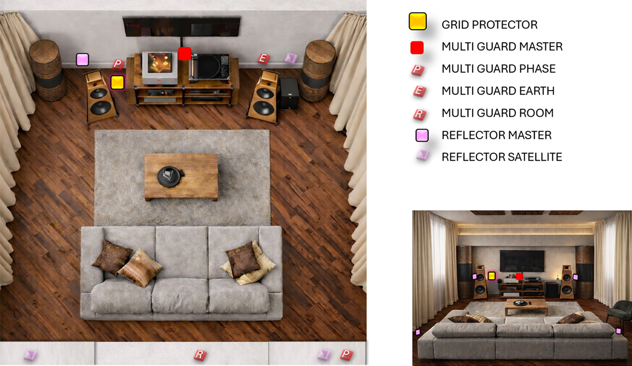 My last step with the original giga cancelling techn was the addition of piccolo protectors. Having a master and three satellites, I already knew that I'd spend some time on positioning. When I started with the master in the middle of the front wall, one satellite behind me close to the rear wall and the other two behind the speakers aligned along the front wall ~75cm off the floor, I detected a further improvement of the perception of the space within which the music recreated.