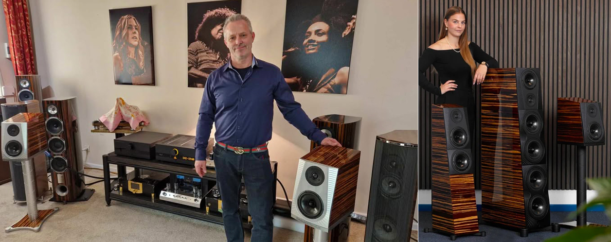 Kim Storgaard, Caspar's brother-in-law, co-founder and head of sales with Franco Serblin and Triangle speakers plus his own | Laerke Vestskov Poulsen, the CEO's daughter posing for size reference against their three models.