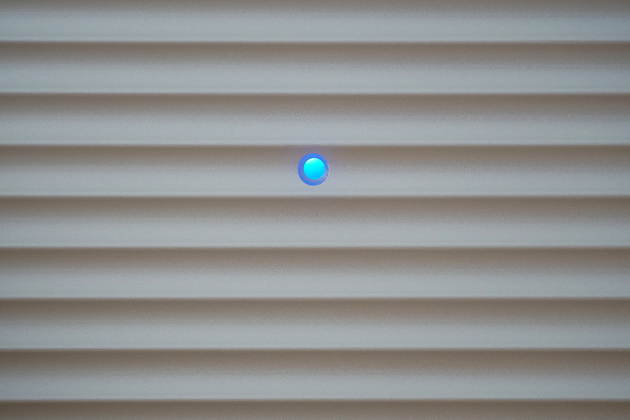 This small LED is associated with a floor-facing smoky acrylic slot along the fascia's edge which leaves blue glow beneath the box.