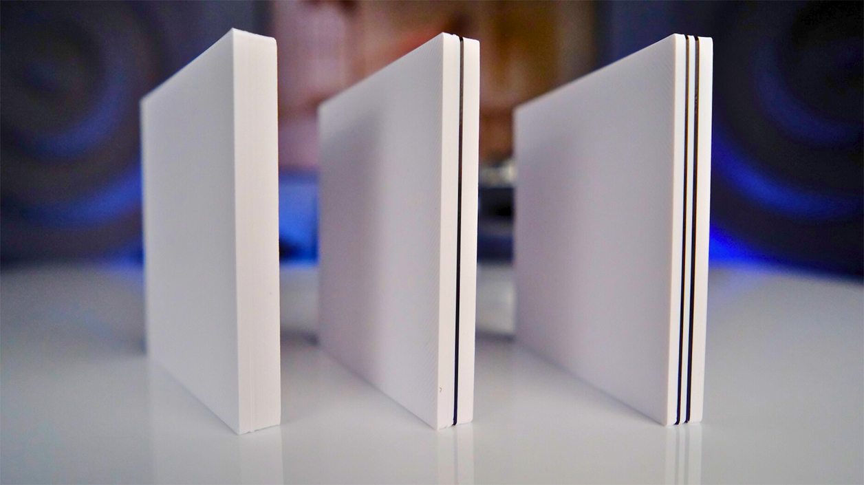 September 5. "I'm exploring giving Viper and Cobra a classic look with smooth painted surfaces. I've experimented more with 3D printing, specifically focusing on damping the walls for plain external surfaces. While I can still use internal trickery with textured surfaces and passive radiator frames for extra stiffening for amazing bass from a small enclosure, damping remains crucial to overall performance. Since multi-material 3D printing is very efficient with my twin-nozzle printers, I've explored imprinting layers of TPU—the elastomer I use for the Vibron isolators—between PET-G. I printed samples of pure PET-G, a 5mm, 1mm and 5mm PET-G/TPU tri-layer sandwich and a 4mm, 1mm, 2mm, 1mm and 3mm 5-layer version. The results are great so I will move forward with this composite approach. The prototype samples are already at the paint shop to work on achieving a perfect finish."