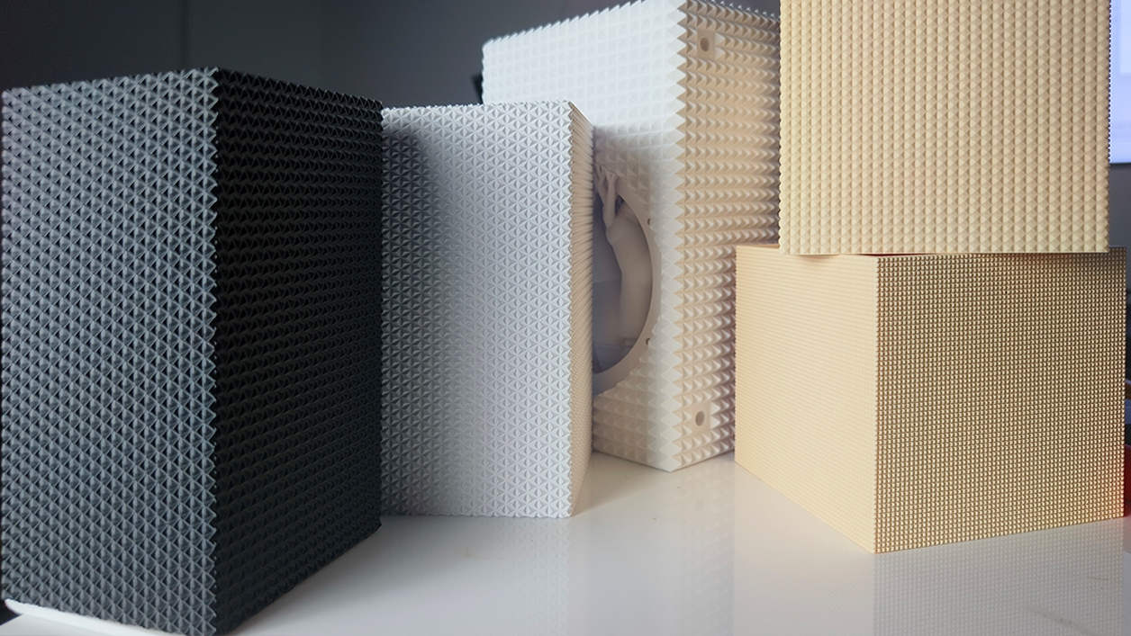 "When it comes to Cobra's structure, the elongated cubes stack and separate with TPU spacers. The internal reinforcements of ring support for the Dayton magnet and braces for the radiator baskets which I experimented with remain. The crossover fits between the lateral radiators. Because my capacitors are enormous, the crossover splits into two parts. The AMT filter goes into the upper box, the mid/woofer crossover into the lower one. Even though initial cabs are printed, I spent the last few days exploring other patterns. Why not use the 3D printing process to create some stunningly beautiful and interesting finishes? So my printers are running 24/7 to create physical samples to pick from. I already have a favourite so may want to redo your samples. In that case you'll have to wait right until the Warsaw show."