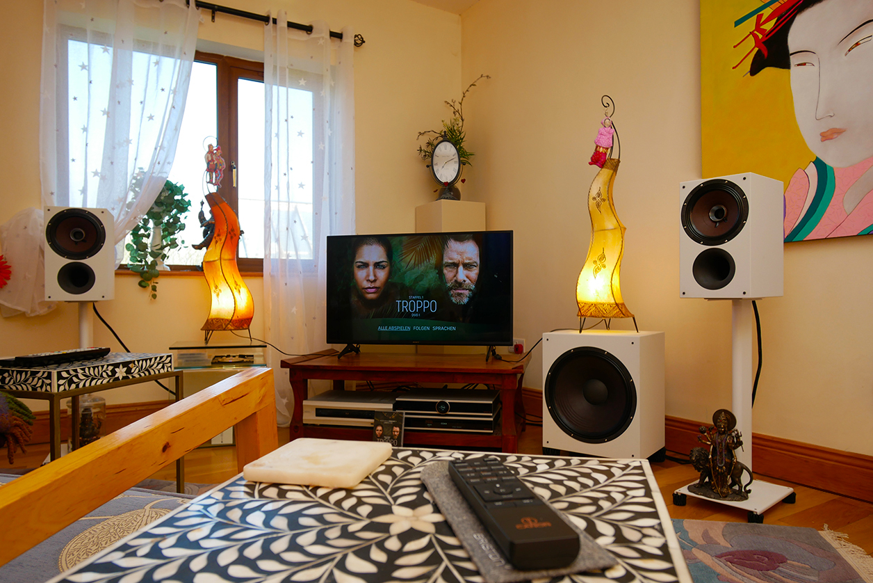 In casa 6moons, Vibron footers beneath Zu Method monitor stands and Zu Method subwoofer.
