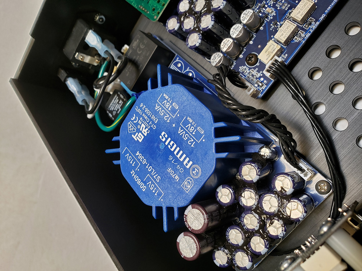 The encapsulated Amgis power transformer is a 25VA type with 18V secondaries.