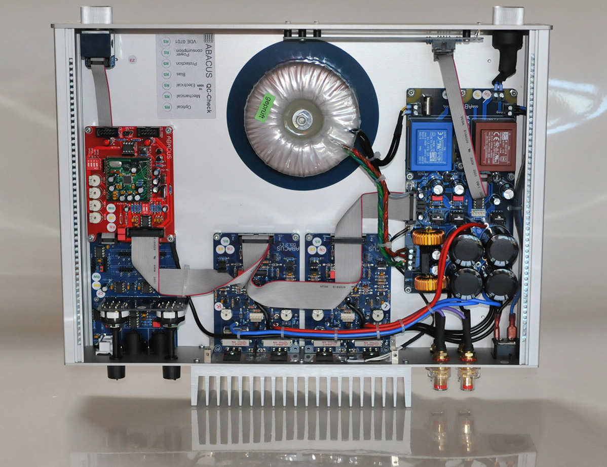 Completing the OB driver array is a Gemini MkII dipole tweeter between the widebanders. With the baffles placed in front of our large front wall in glass, the Gemini tweeters offered a unique see-through lens which revealed their star-like internal structure inside the wooden horn. Over at the low-frequency processing units, we met the German Abacus 60-120C power amplifiers. Robert chose them because they use the collector of their output transistors to drive the speakers, not the emitter as most solid-state amplifiers do. This frees up constant maximum current regardless of load whilst 100% negative feedback adds even more control to couple amps and woofers as though with a rod. For use with these Ultimate dipole woofers as they have been baptized, the amplifiers are set to bridged mode. Beyond their standard stock makeup, the Bastanis version are equipped with an Abacus DSP board whereby a few trim pots can dial in time delay, a low cut from 16 to 48Hz and a low pass from 50-150Hz. We left the top of the amps off to make easy adjustments.