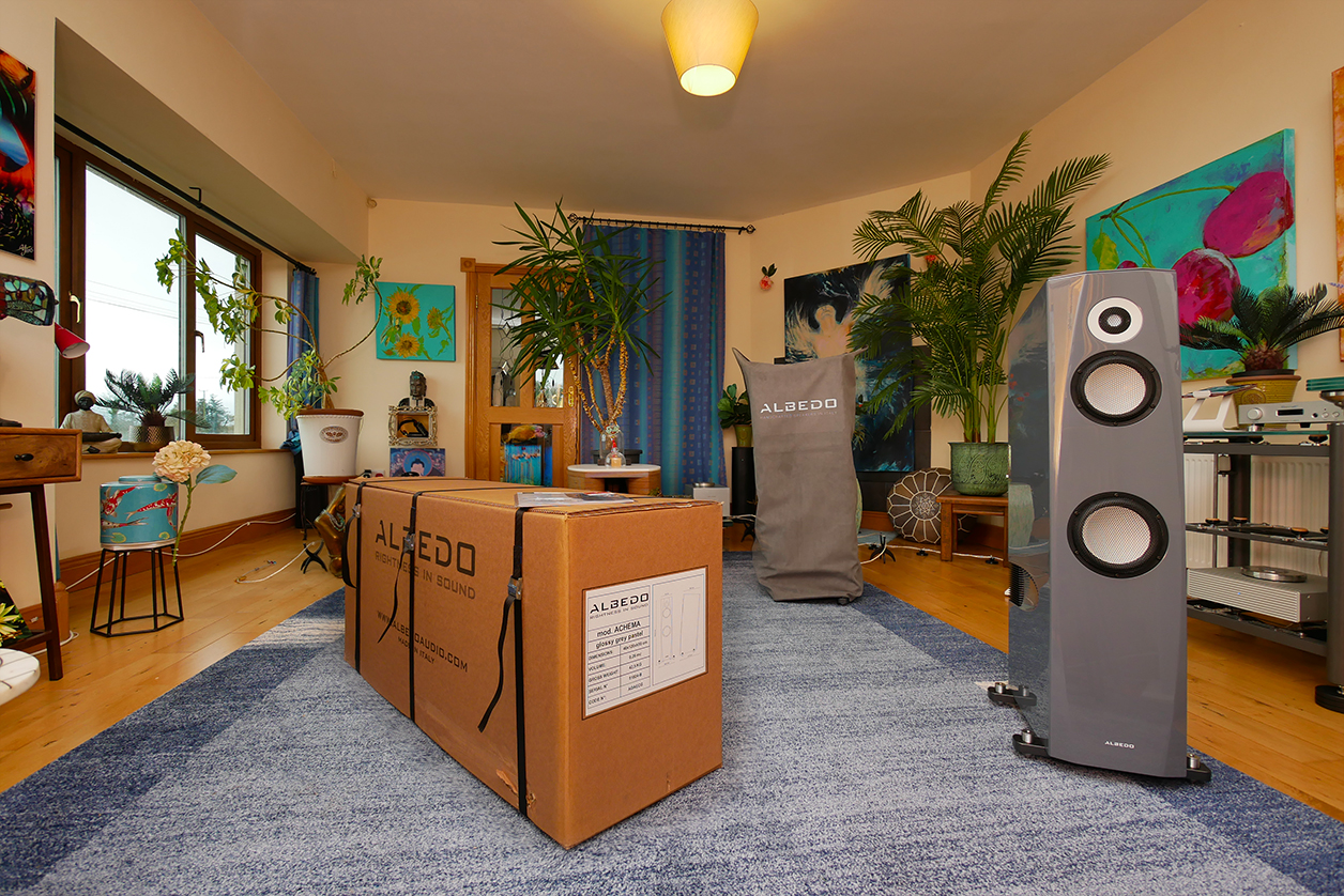 Geeking out over packaging really takes the cake. But what to do when the bread runs out? Albedo Audio's Achema arrived in this apparently ordinary carton whose only initial difference were its three reusable straps in lieu of tape or staples. Lay the box on its side with the writing up as shown. Undo the straps and everything comes apart. First the bottom-less outer sleeve lifts off to then fold flat which stores away swell. Underneath the top hard foam, the cardboard sides with foam spacers and the top and bottom foam all fall out. The only thing left is a shallow bottom cardboard tray in which sat the loose side panels and top and bottom foam ends. That bottom cradle has another glued foam liner with cut-out for the binding posts. With nothing else left of the packaging now so naught to lift or walk out, all we're looking at is a speaker on its back on the floor, inside a protective cloth sleeve atop a shallow carboard tray. Cant up the loot on its pre-mounted outriggers with spikes whilst stowing away all packaging neatly flat for minimum fuss. No specialized ClipLoc tech involved, just utterly ordinary cardboard assembled more cleverly to make a real difference when a single person is tasked with unboxing and later repacking a reasonably heavy speaker. In 23 years on the beat, I'd never seen it done this smartly so wanted to memorialize the occasion with a super-geeky mini feature. Now I did and you're off wondering what baloney gets single older men excited.