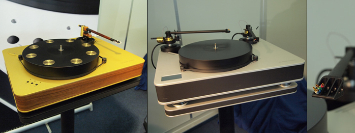 To give analog equal coverage let’s look at Dr. Feickert’s €6.000 Blackbird whose particular gold scheme as per distributor Stefan Beckert of B&T was a custom commission for foreign markets which might also catch on domestically. Standard features are the adjustable arm board, an optional second board, twin-motor drive and POM platter with integral setup markings. The ca. €8.000 Firebird gets three motors, a more ambitious chassis construction and an aluminium platter with POM inlays.