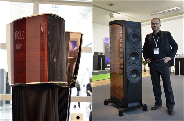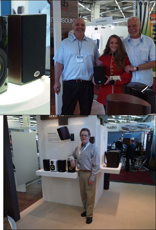 We stopped for a quickie at Canada's PSB whose new €800/pt Imagine Mini is clad in real wood veneers. "Astonishingly large grounded transparent and mature sonic imagery" read the notes for a reminder that quality sound needn’t involve remortgaging the house or ruining domestic tranquility with monkey coffins (Germany’s importers Robert Ross and Klaus Stahl asked their charming hostess to join for a photo op.) The 14cm mid/woofer is powered by two magnets whose added drive fills out tonal substance despite demure box dimensions to have been designed without need for a sub (designer and company founder Paul Barton at right). |