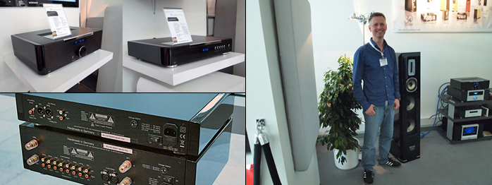 To not unduly stress the little surprise word, certain visitors to Quadral still would have been. Whilst company addition Sascha Reckert hammed it up next to their updated heavyweight Titan in VIII iteration, the speaker firm from Hannover also snuck in their own range of electronics. There are two integrateds (€2.850 A5 and €2.000 A3) and two CDPs (€2.400 C5 and €1.800 C3) all with real-wood trim. The amps talk of studio-borrowed volume control solutions to optimize channel balance and get sealed gold-contact signal relays, discrete output stages and overbuilt power supplies with extreme line filtration. The A5 runs in dual mono and has XLR inputs. The spinners strut 24/192 BurrBrown chips, bi-FET op amps and broadband line filtering. The C5 adds a master clock generator and XLR outputs.